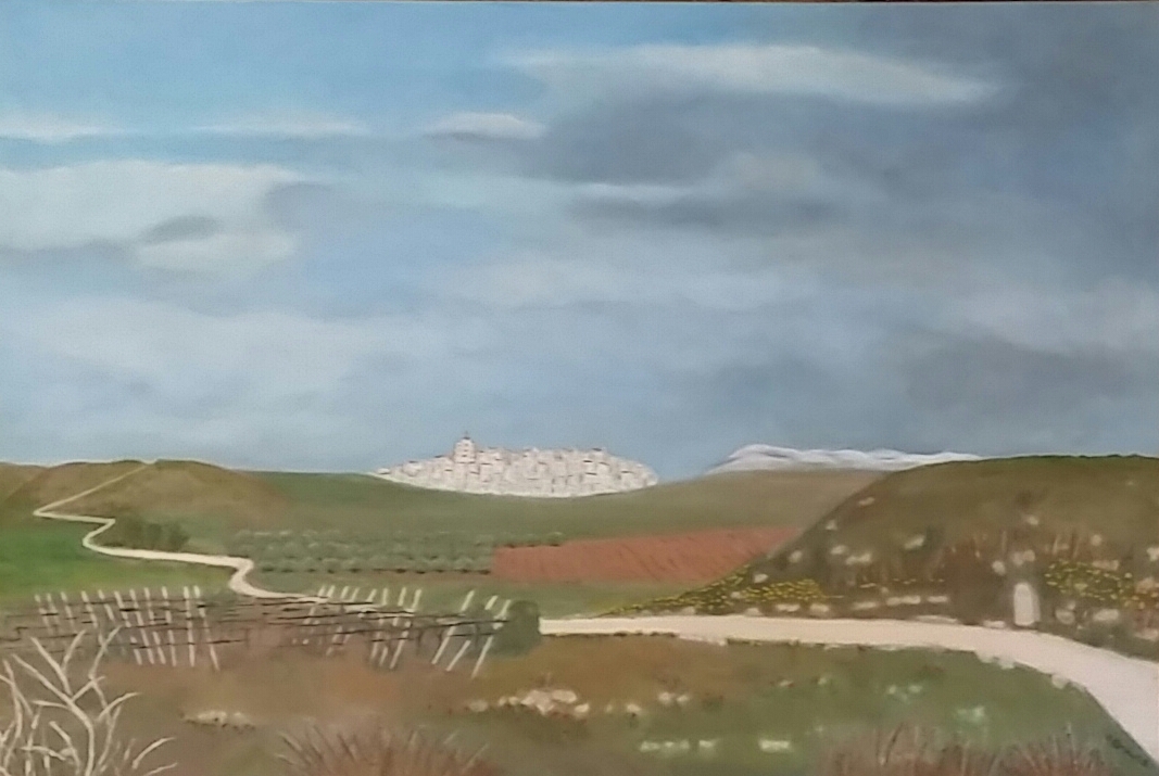 Approaching Cirauqui on the Camino is a oil painting on quality stretched canvas by Heather Browne.