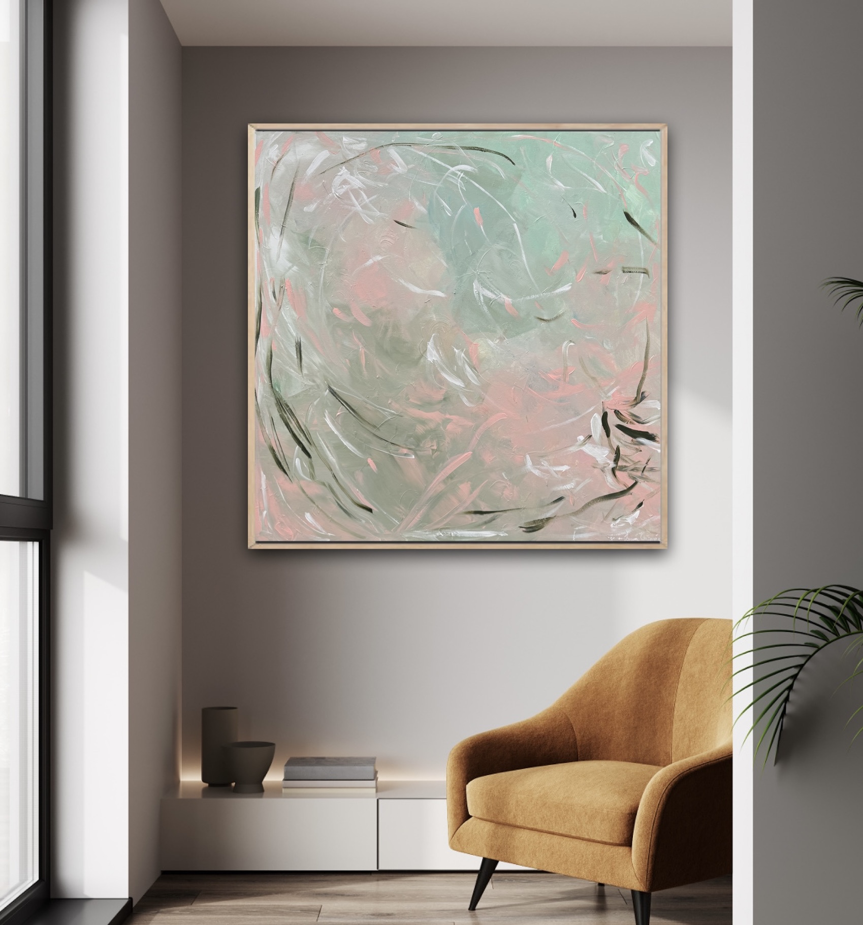 ‘Apricot Hush – Framed 104x104cm’ by Ivana Gigovic –