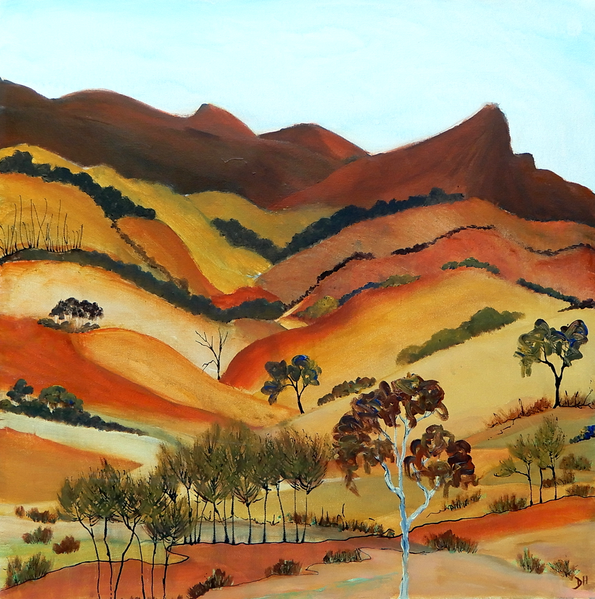 The hills of Tjoritja, the MacDonnell Ranges that surround Alice Springs. This artwork is part of a small body of semi-abstract works inspired by the landscapes around Mparntwe/Alice Springs.