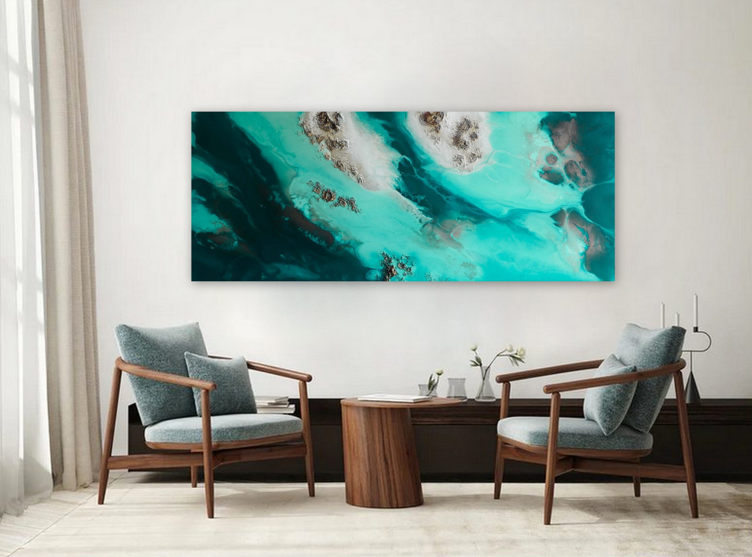 Green Abstract Wall Art “Aqua Visions” by Petra Meikle de Vlas – is a highly textured, 3 dimensional, abstract aerial view of the ocean.