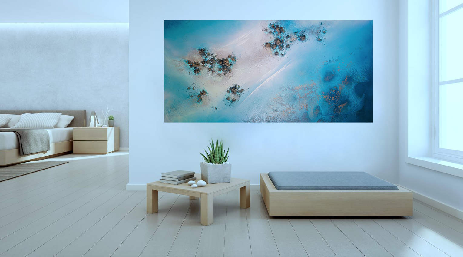 Aquamarine is a 3 dimensional, aerial view of a patch on the Great Barrier Reef. A mixed media fluid painting on a wooden panel.