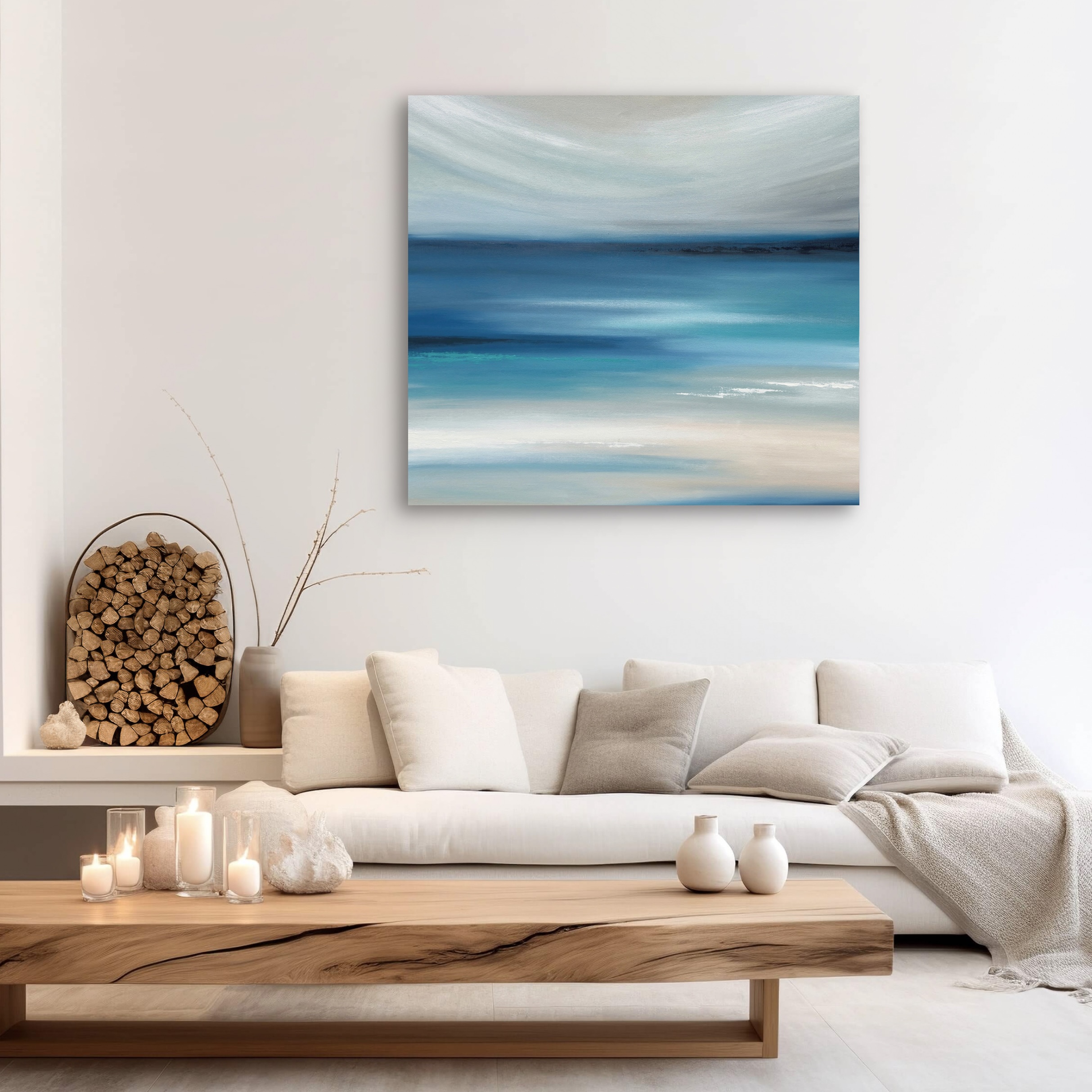 This original artwork captures the soul-soothing essence of the sea with breathtaking elegance, showcasing a masterful blend of colours and techniques, capturing the calming beauty of the sea with soft blues, aquas and sandy neutrals. It evokes peaceful memories, bring a sense of nostalgia, calm and connection to nature.