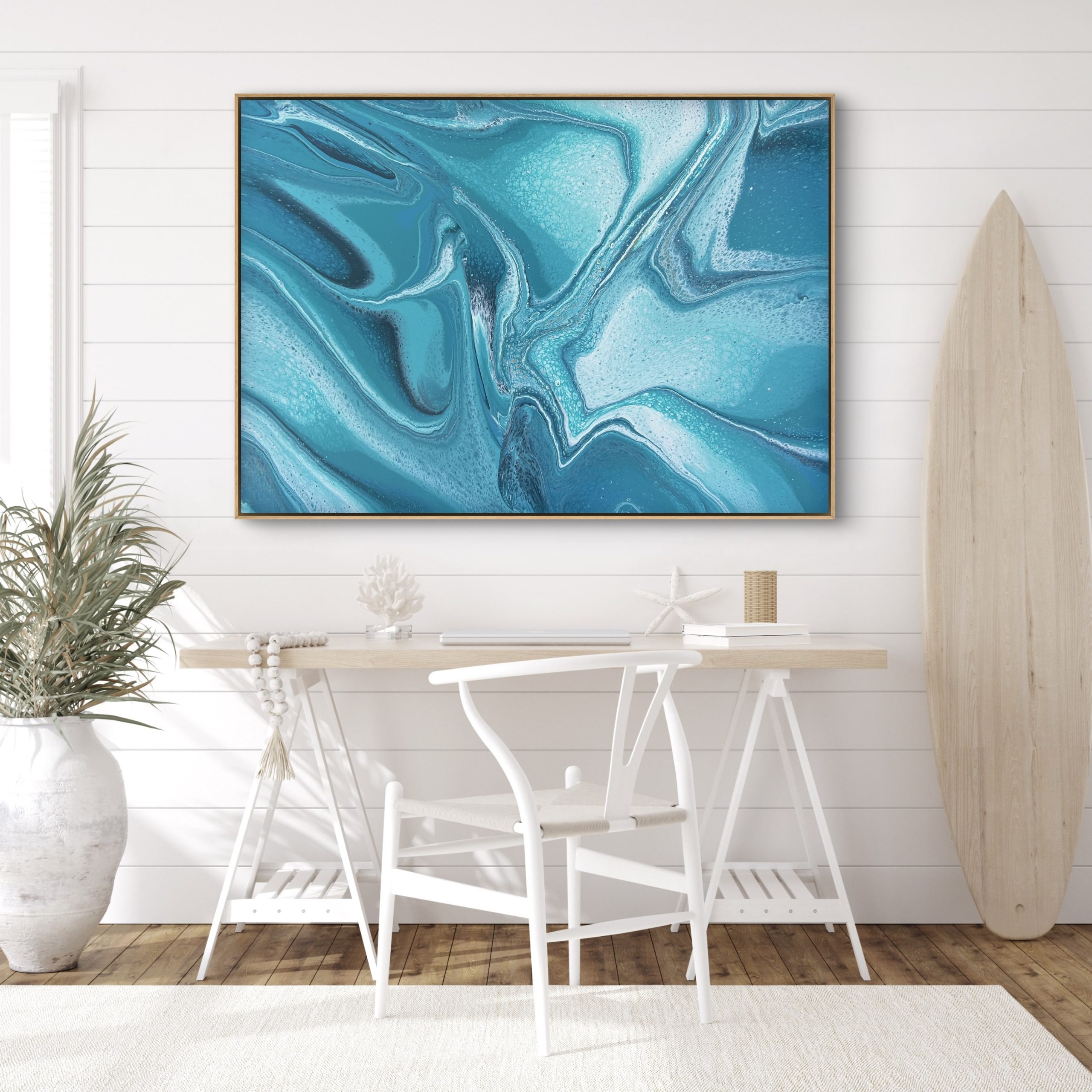This stunning piece is 140cm x 100cm and features shades of aqua, teal, turquoise, white and the slightest touches of metallic gold acrylics. I will sign the bottom left corner when the orientation is confirmed as this painting can be hung multiple ways.