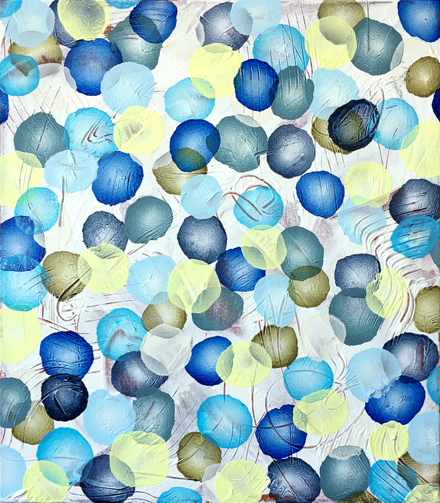 This colour palette is a favourite of mine and I love the lightness and relaxed feeling of this one. The calm ultra-marine blue, aqua and white with touches of olive and lemon yellow creates a gentle shimmer cross the surface of this artwork. A joyful reminder of the effervescence contained within the waters of life. It also reminds me of warm summer days by the water with the foam and bubbles of the surf.