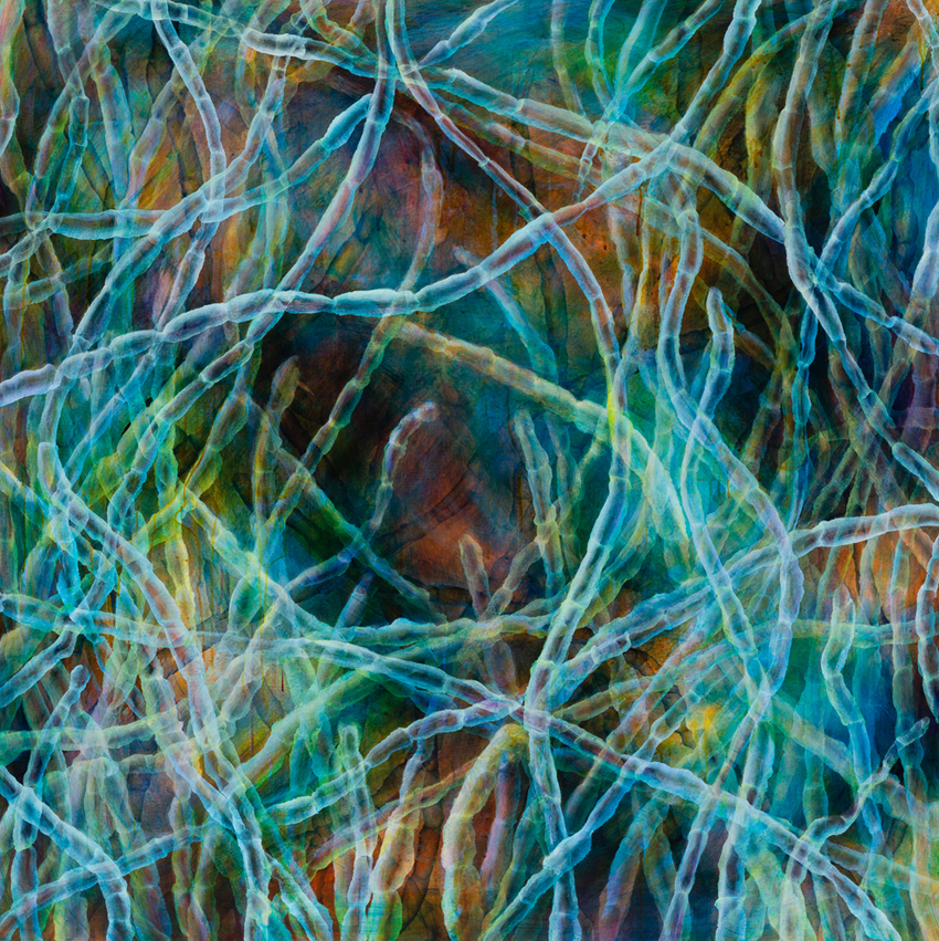 These fibrous cellular forms I have placed in infinite fluid like spaces reminiscent of deep water, drifting like seaweed and dainty aquatic-life. The light is inspired by the colourful world beneath the waters surface as well as what lies below the lens of a microscope.