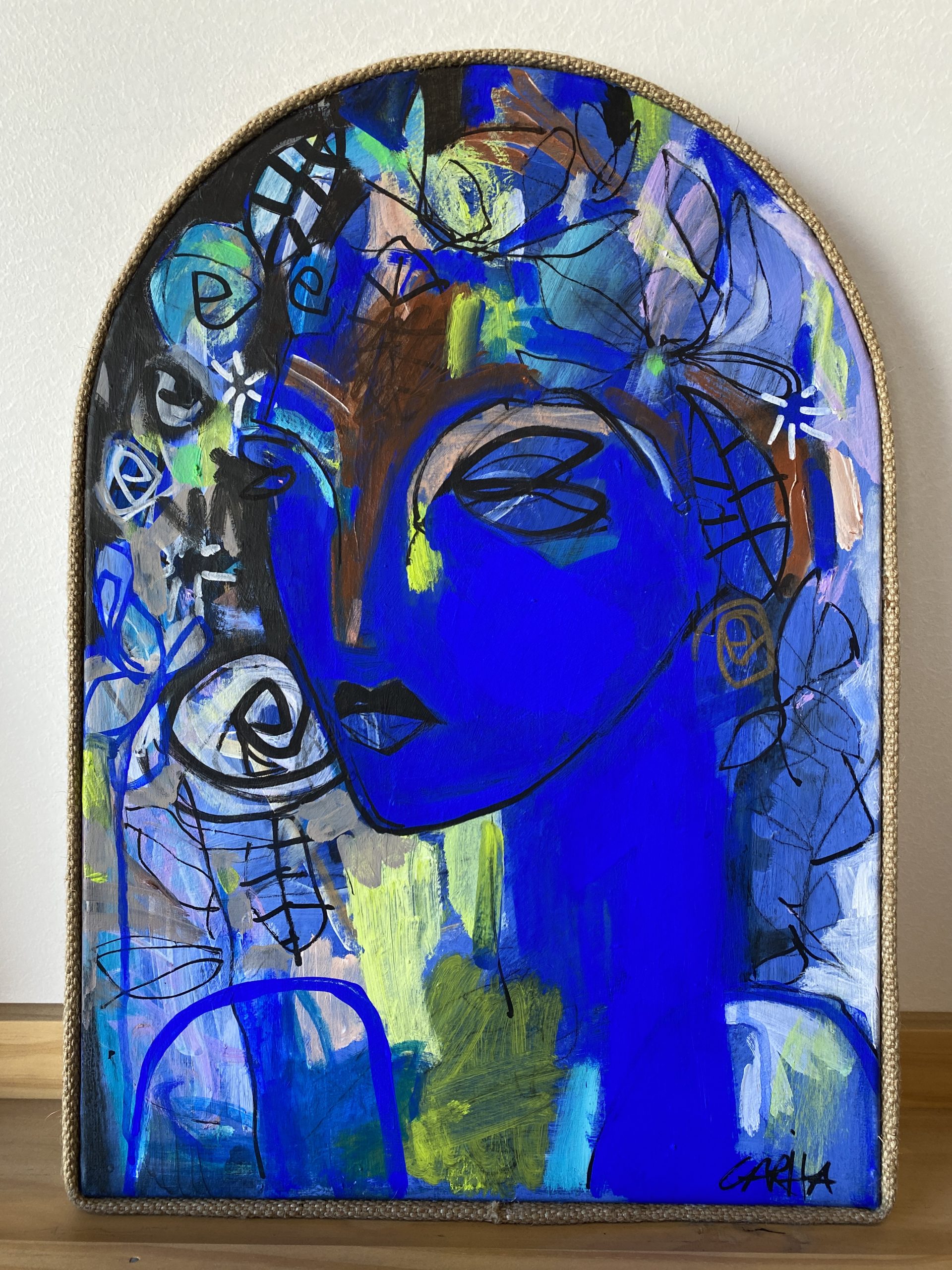 Acrylic on arch stretched linen canvas with Jute frame, ready to hang.