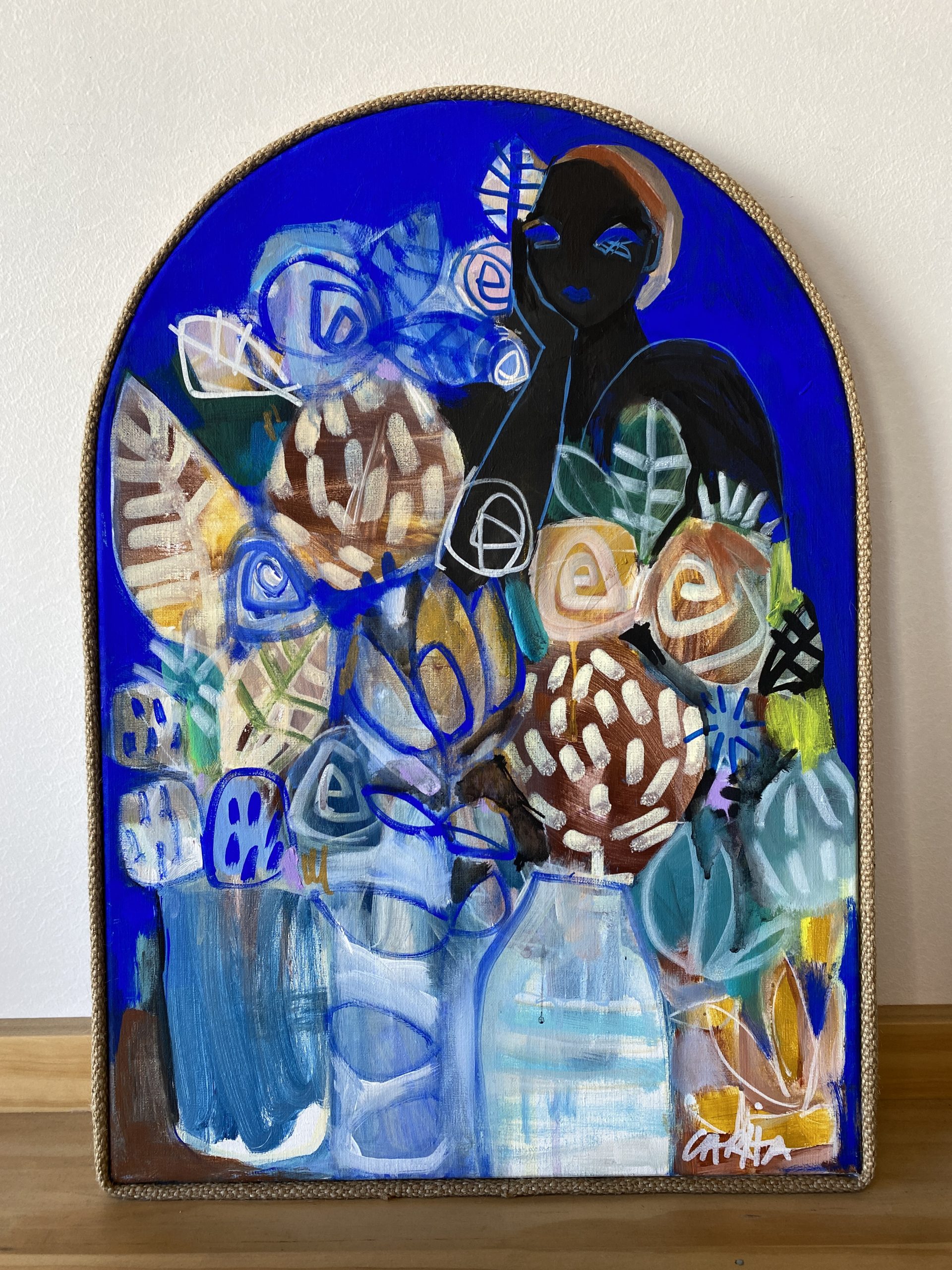 Acrylic on arch stretched linen canvas with Jute frame, ready to hang.