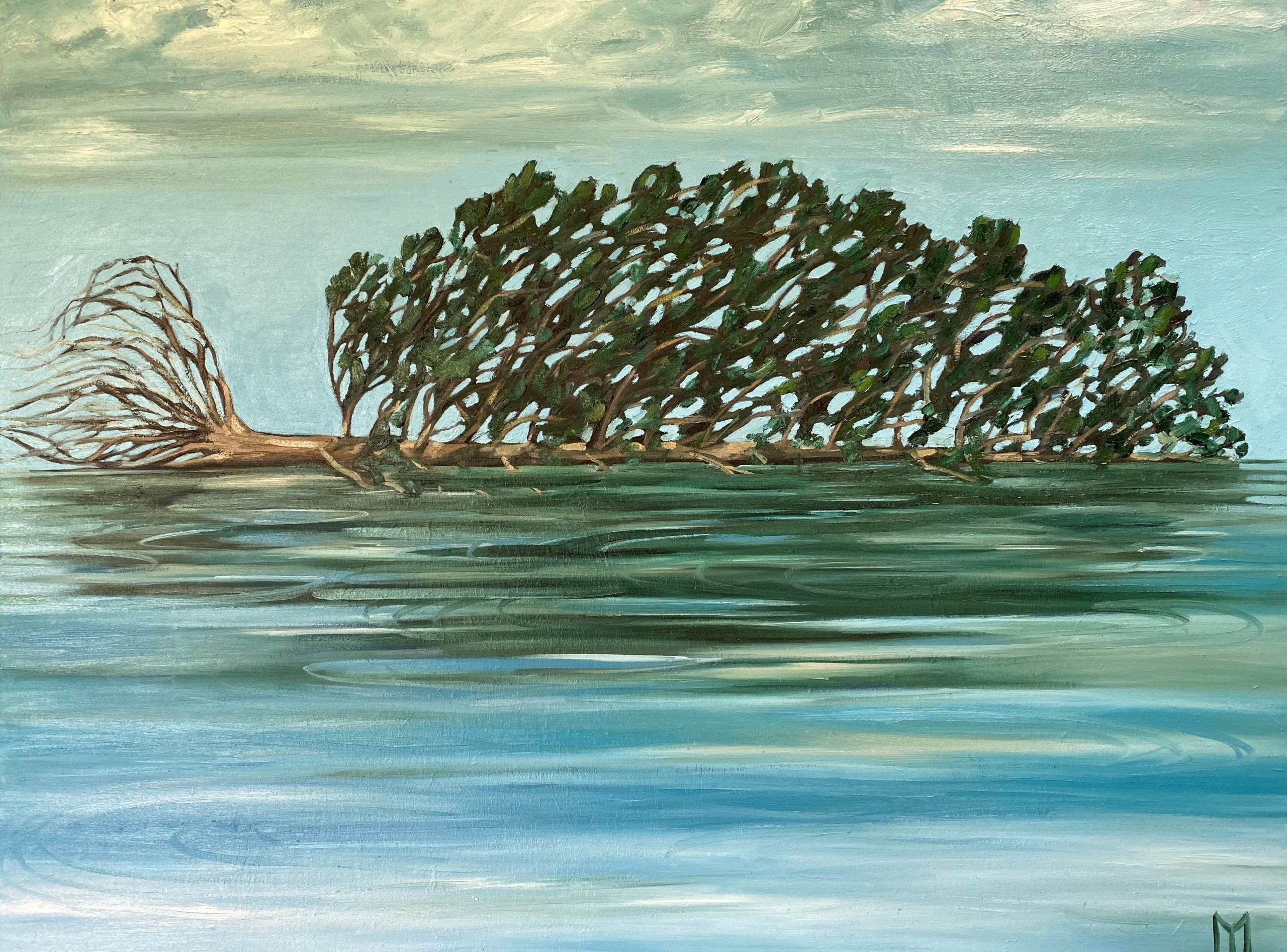 My original painting is a narrative image about the importance and beauty of trees. The tree is a symbol of life and hope in this time of fearfulness about the future for our natural environment. Â I want the audience to perceive the tree as a sentient being or a spiritual guide. My ideas come from many years of mentally collecting imagery, otherwise known as daydreaming. My trees are well known characters taken from the landscape and repositioned in a situation to invite the viewer to connect on an emotional and spiritual level, and to bring attention to the vital importance of trees and their role in our ecology.