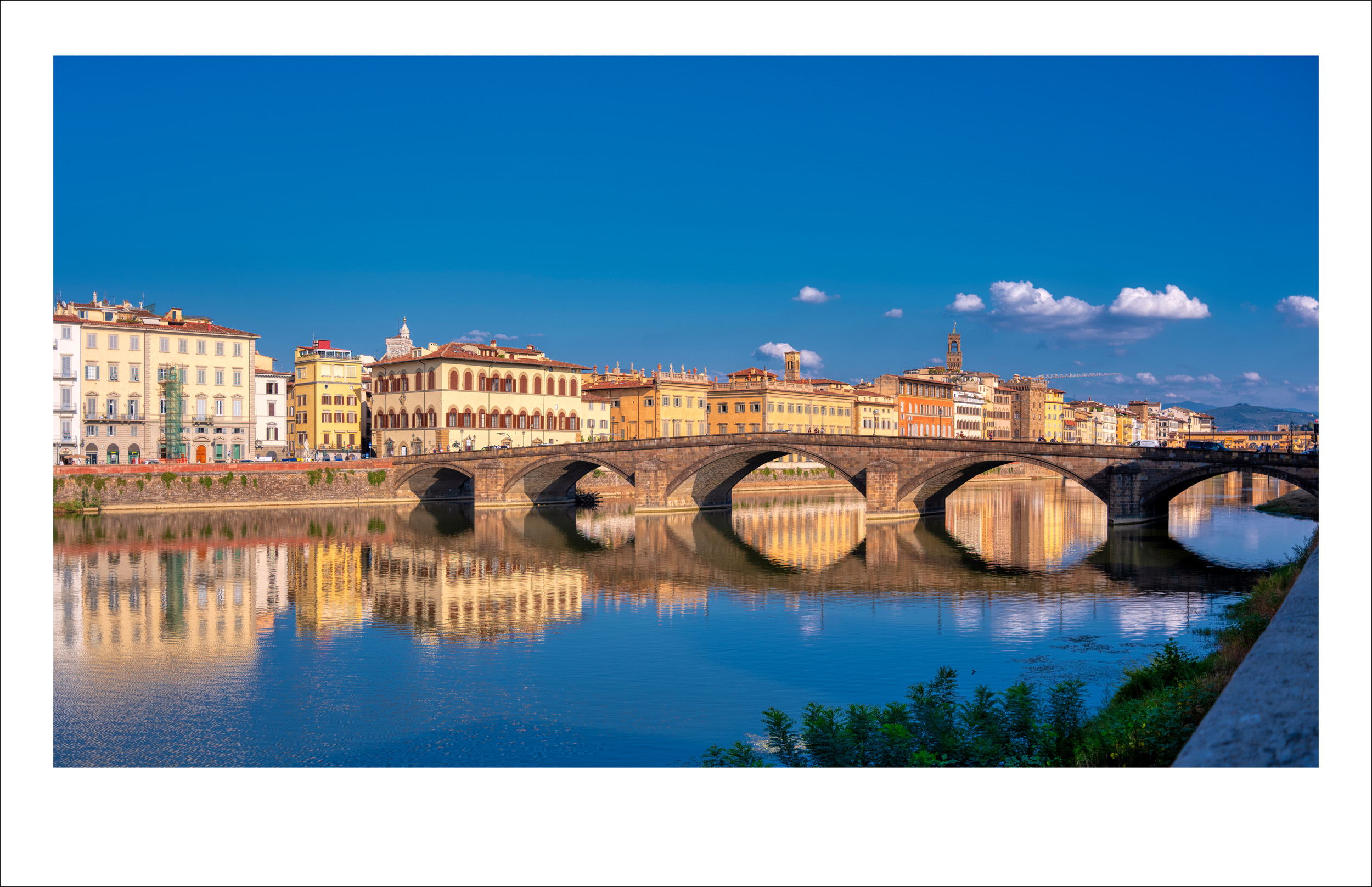 The timeless beauty of Florence comes alive in this tranquil riverside scene along the Arno. Captured under a crystal-clear sky, the elegant bridge and centuries-old buildings glow in warm afternoon light, their reflections shimmering gently across the water. This image celebrates the harmony of architecture, history, and nature that defines the heart of Tuscany’s capital. Photographed in Florence, Italy.