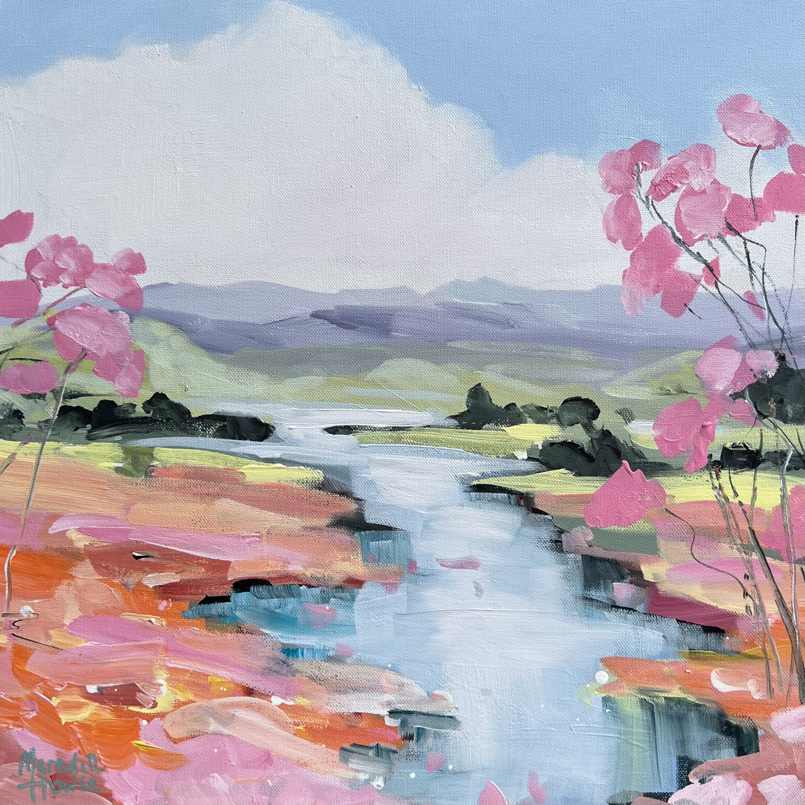 As Blossoms Bloom by Meredith Howse captures the serene beauty of nature in a captivating and harmonious composition. This artwork portrays a picturesque valley with a small stream, gracefully winds its way, meandering along.