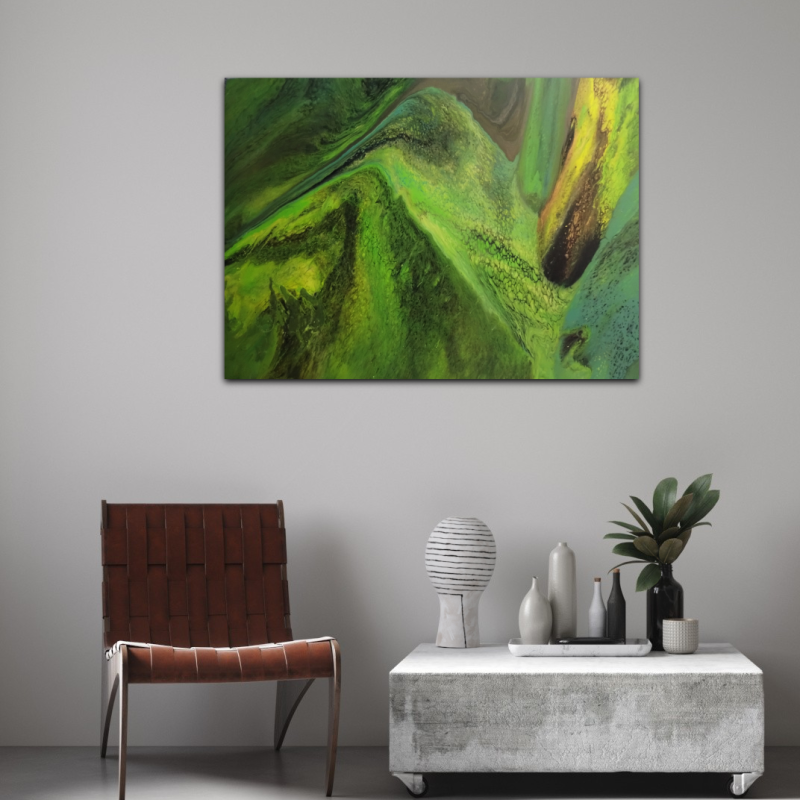 The background is composed of layered blue-green tones, creating a cool, atmospheric field that both complements her hair and heightens the intensity of her gaze. The overall effect is modern, fearless, and visually arresting — a portrait that celebrates individuality and presence with clarity and poise.A floating frame is optional.