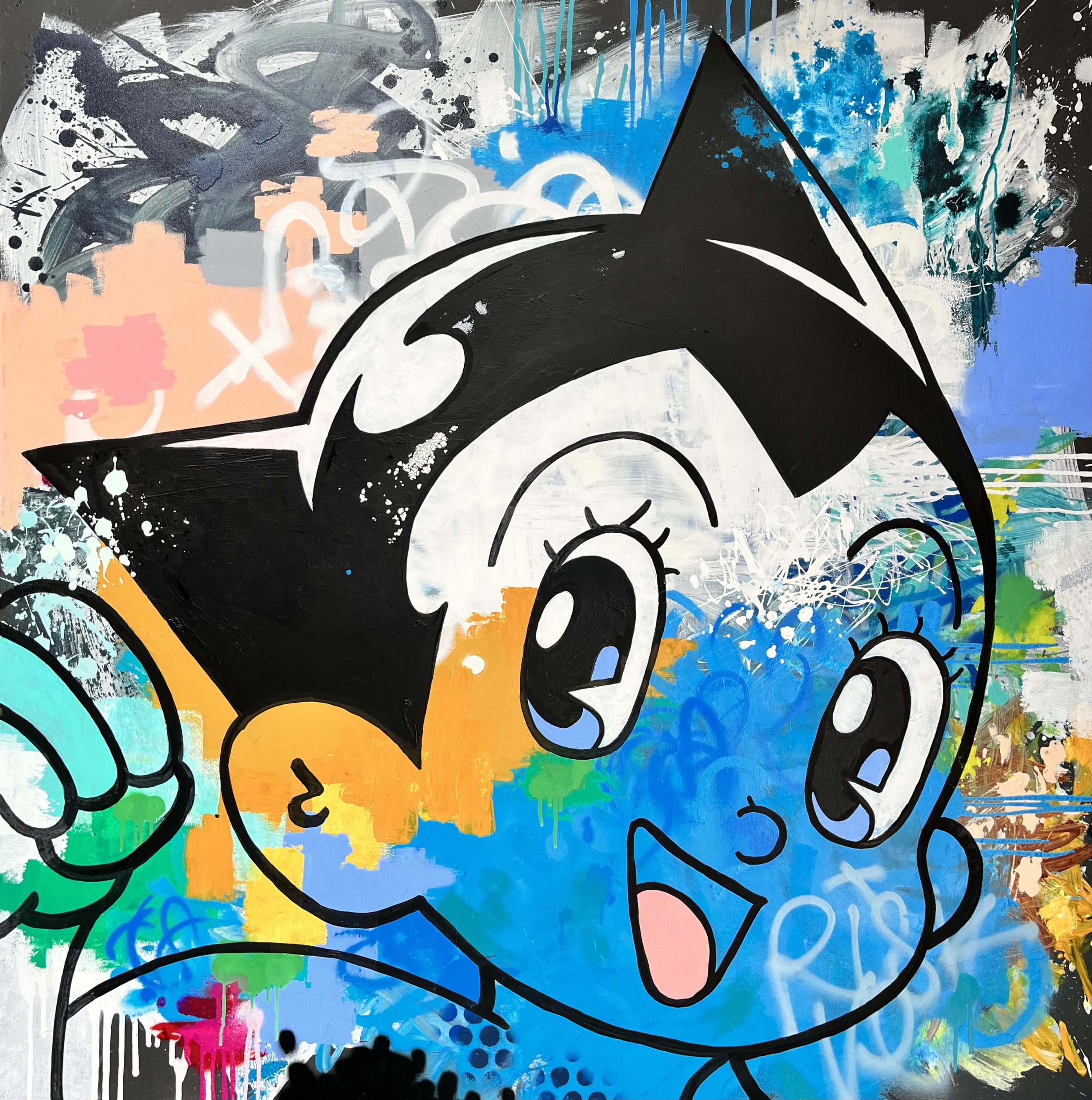 This original Mixed Media Artwork was created first by layering paint to build up the Abstract background effect. Then Iconic animation character Astro Boy was added over the top and blended into the abstract.