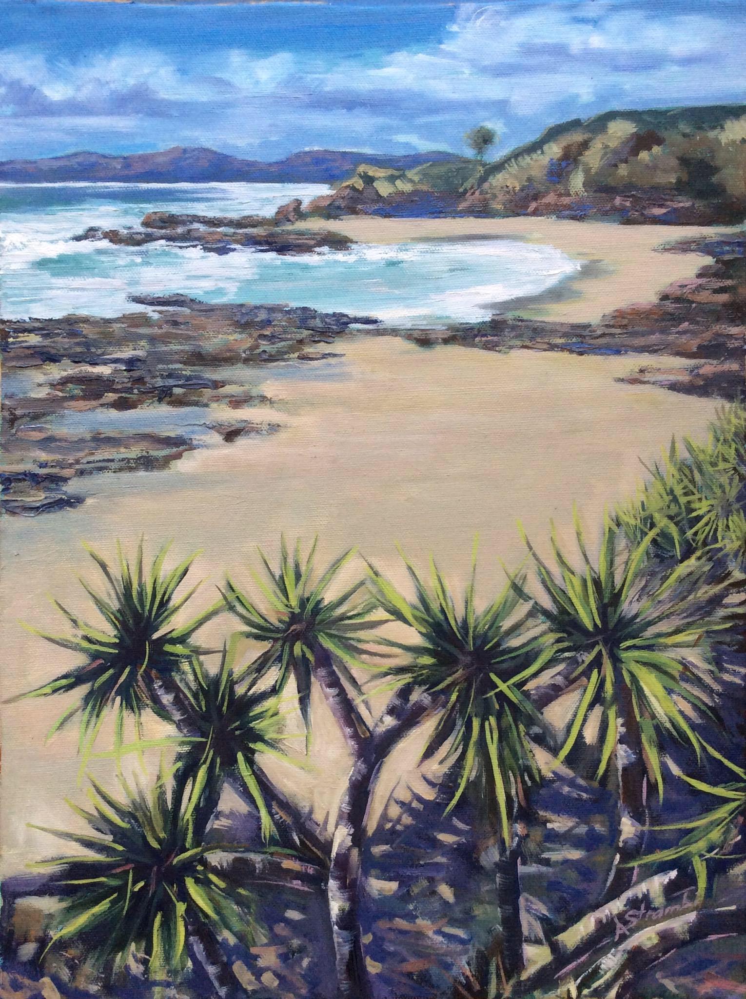 I had painted a version of this subject some years ago, but was inspired to paint it again in a different way. It is painted loosely in an impressionist style using both brushes and a palette knife. It was inspired by a favourite beach location Minnie Water where we used to have family holidays. A favourite walk was along the coastal path towards Back Beach where there are lots of small picturesque inlets and headlands.