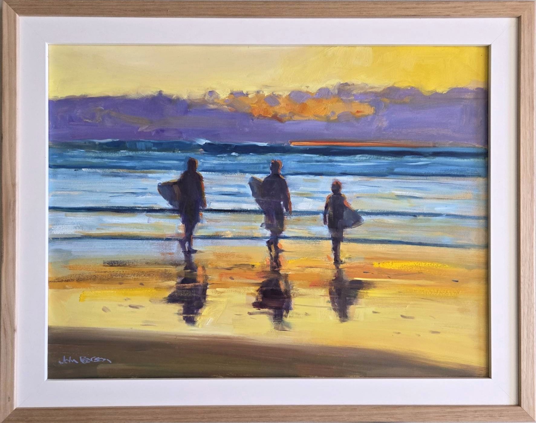Original oil painting by John Pearson – shows a trio of young surfers entering the water as dawn breaks over a cold ocean with wind-swept waves.
