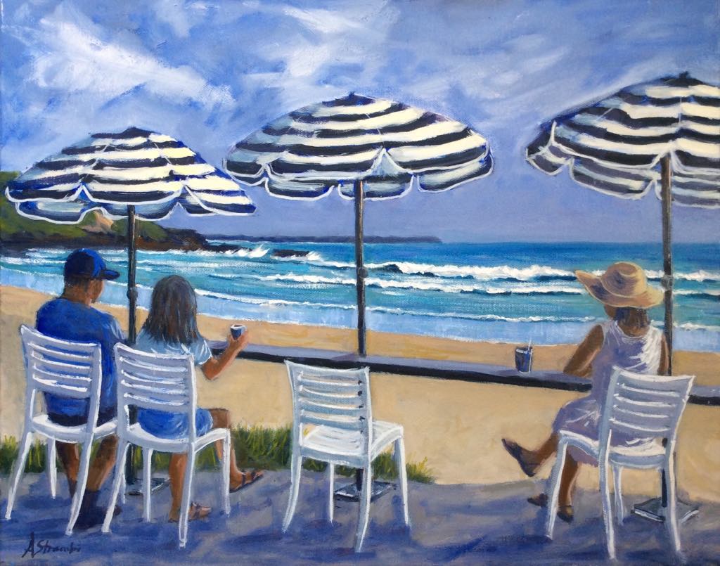 A favourite spot to have coffee, sketch and watch the waves! This is my second painting in the Kiosk series. The Kiosk is a lovely beach side cafe with stripey umbrellas, located at Main Beach Yamba. You can just have coffee or enjoy a delicious breakfast before your swim. I wanted to depict the relaxed holiday vibe of this lovely spot. This painting is sold in a pine box frame and is ready to hang.