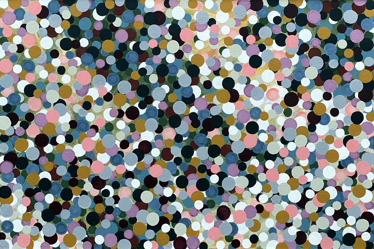 This painting moves our eyes attention in and out of focus across the picture plane. Each dot is dependant on the next for its visual ‘pop’. I really enjoy that your eyes get to explore and discover so many different colours and dynamics, and subtle hidden shapes and textures within the surface. I hope it is a joy to your eye and the mind too.
