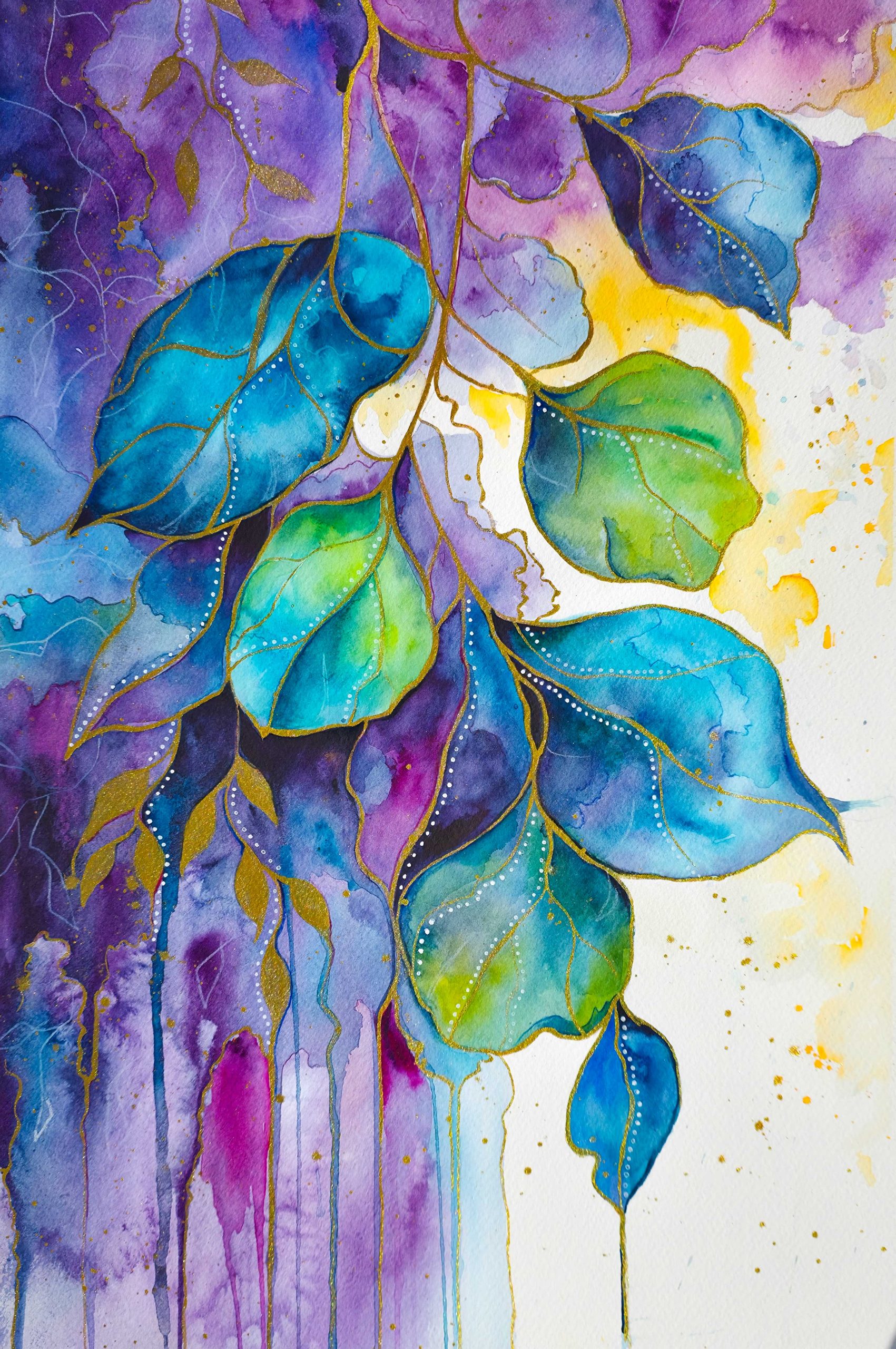 Aurora Drift by Kay Shanley –  a cascade of leaves drifts through a wash of violet, blue, and green, touched with delicate gold that shimmers in the light. Inspired by the ethereal beauty of an aurora, this piece invites a quiet sense of wonder and flow