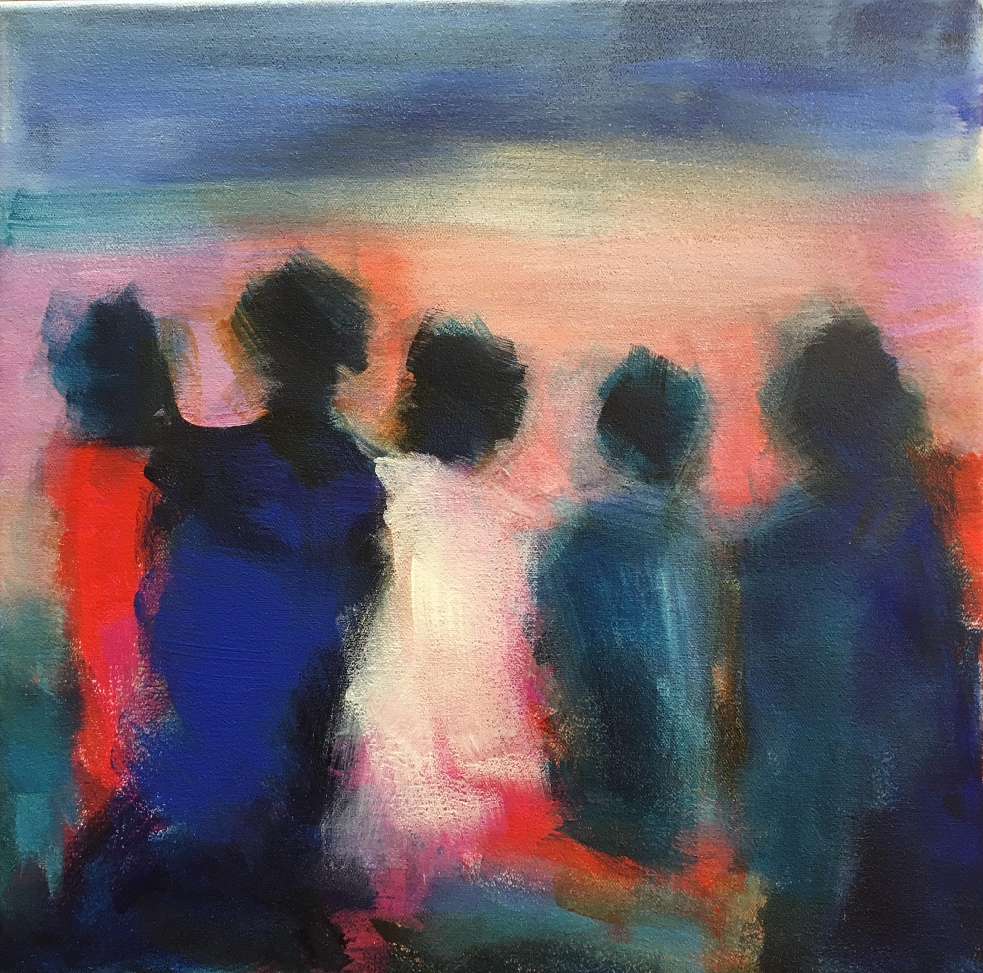 People in Aurora are not shown in much detail, they are essentially in silhouette. Aurora conveys a closeness, a bond of friendship and fellowship. The brushstokes convey a movement in time, a mistiness – not quite clear. Memories of a previous time are captured. The viewer may see themselves in this painting. Perhaps they are central to a similar story like the lady in pink in the middle or a they identify with the figure in red of blue close by her side.
