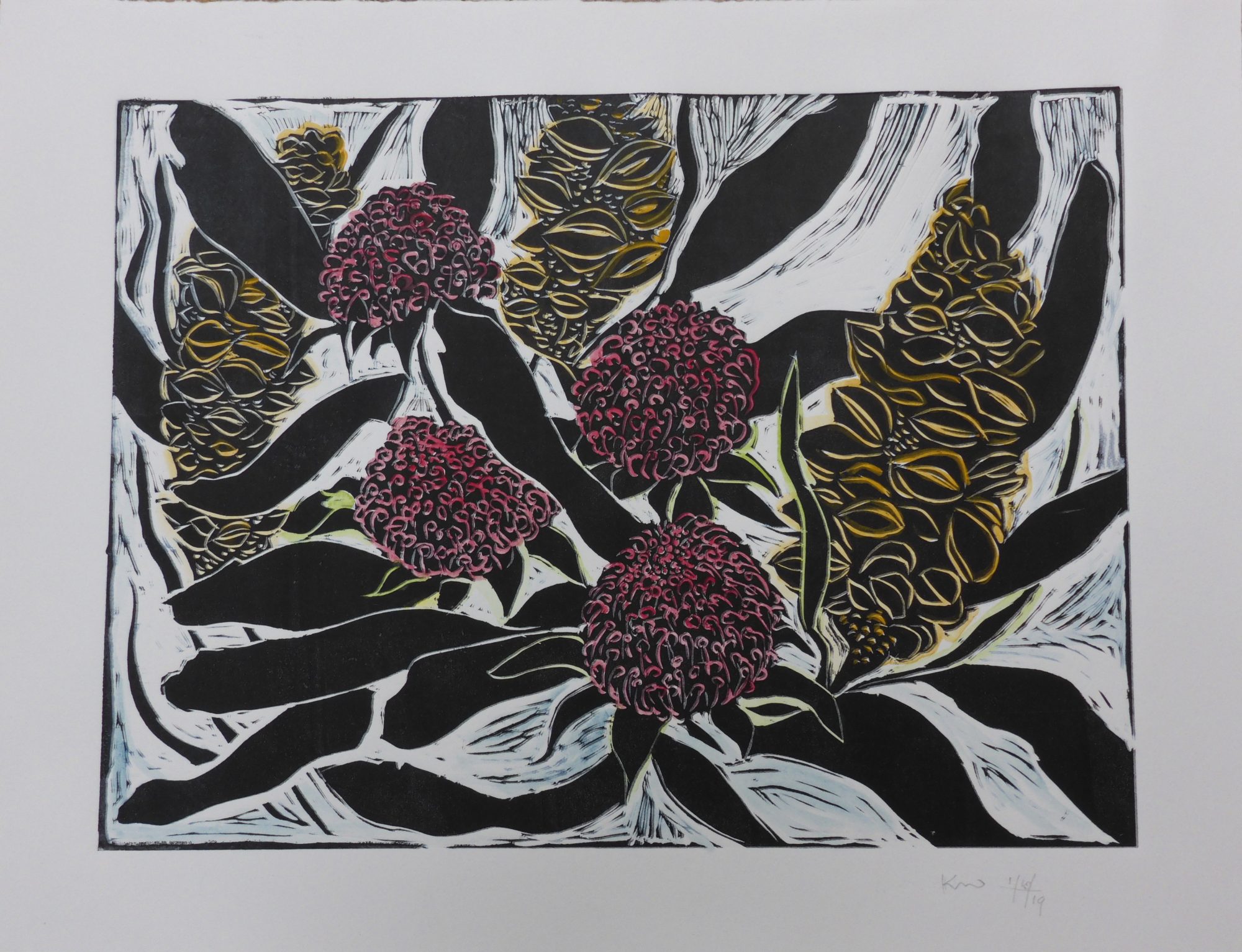 Lino print, hand coloured with tempura and watercolour over black archival inks, hand pressed, a one off original. Obsessed with Banksia’s and Waratahs, this print is a limited edition of 10. Each print will differ from any other as they are individually inked and pressed.