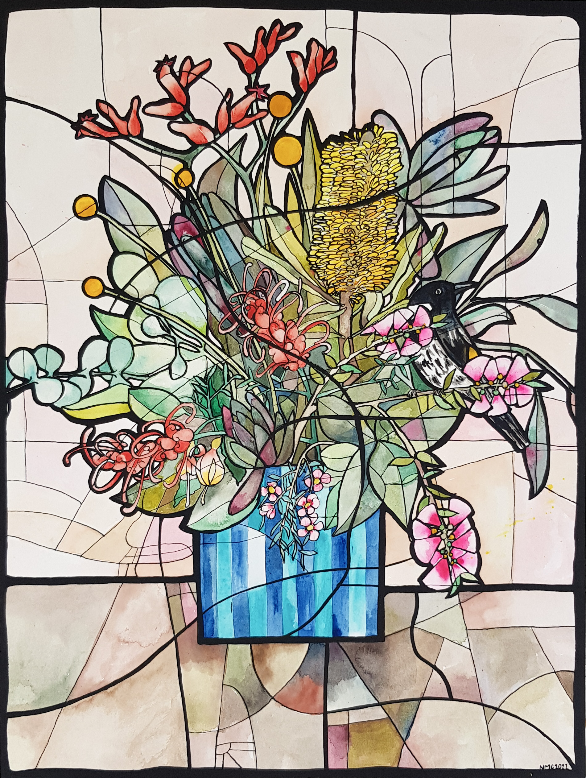 Banksia, kangaroo paws, bottlebrush billy buttons and more are depicted in a blue striped vase with a sweet honeyeater perched within. Each element is stylized and broken down into almost abstract shapes.