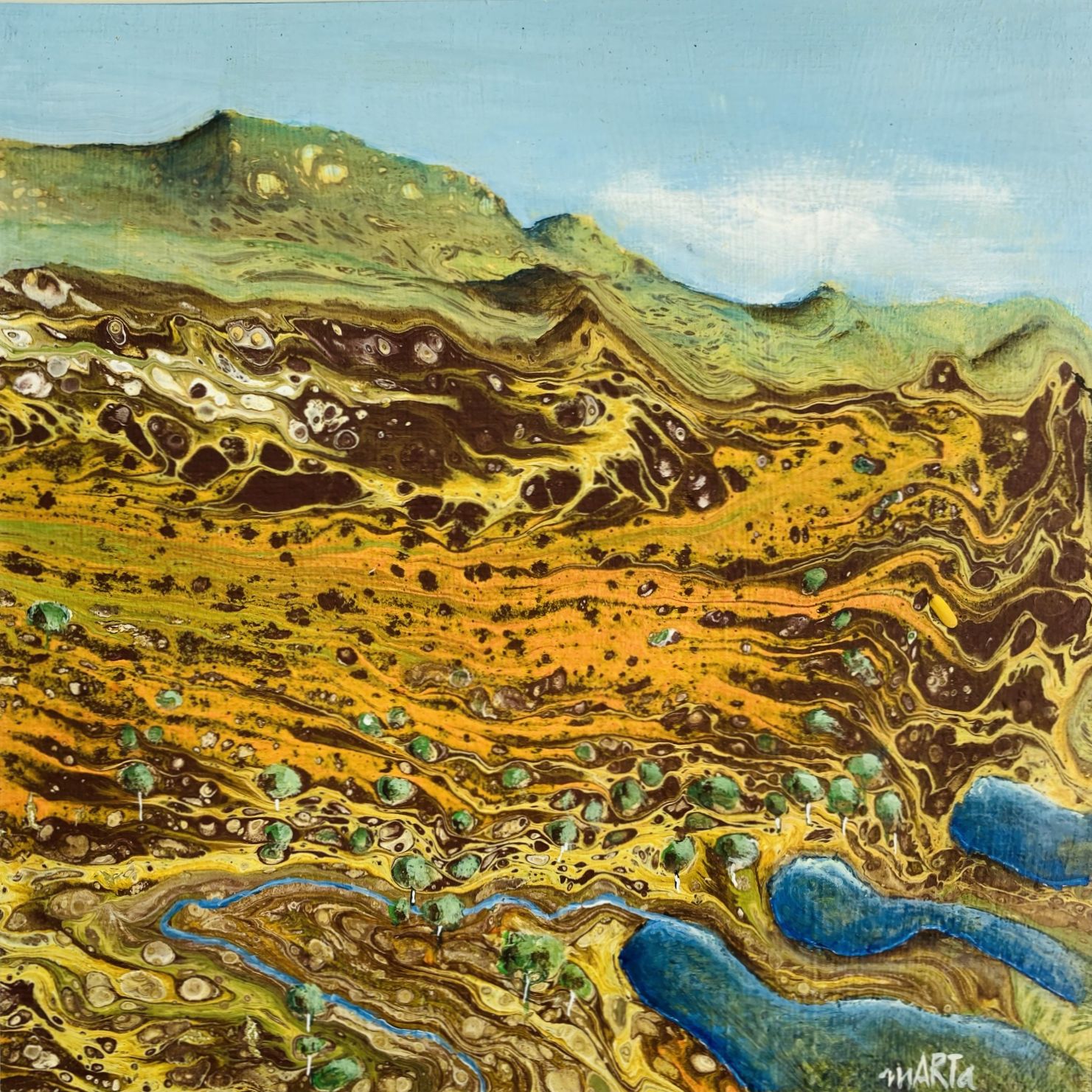 Inspired by the colours of any Australian landscape, I selected strong red, brown, and green colours for this imaginary poured landscape. It just needed to add light and shades to show the mountains, and blue colour was added to make the mountains reach the blue sky. Small pale green bushes and shrubs gave depth to the red soil while three large cells were transformed into three Billabongs.