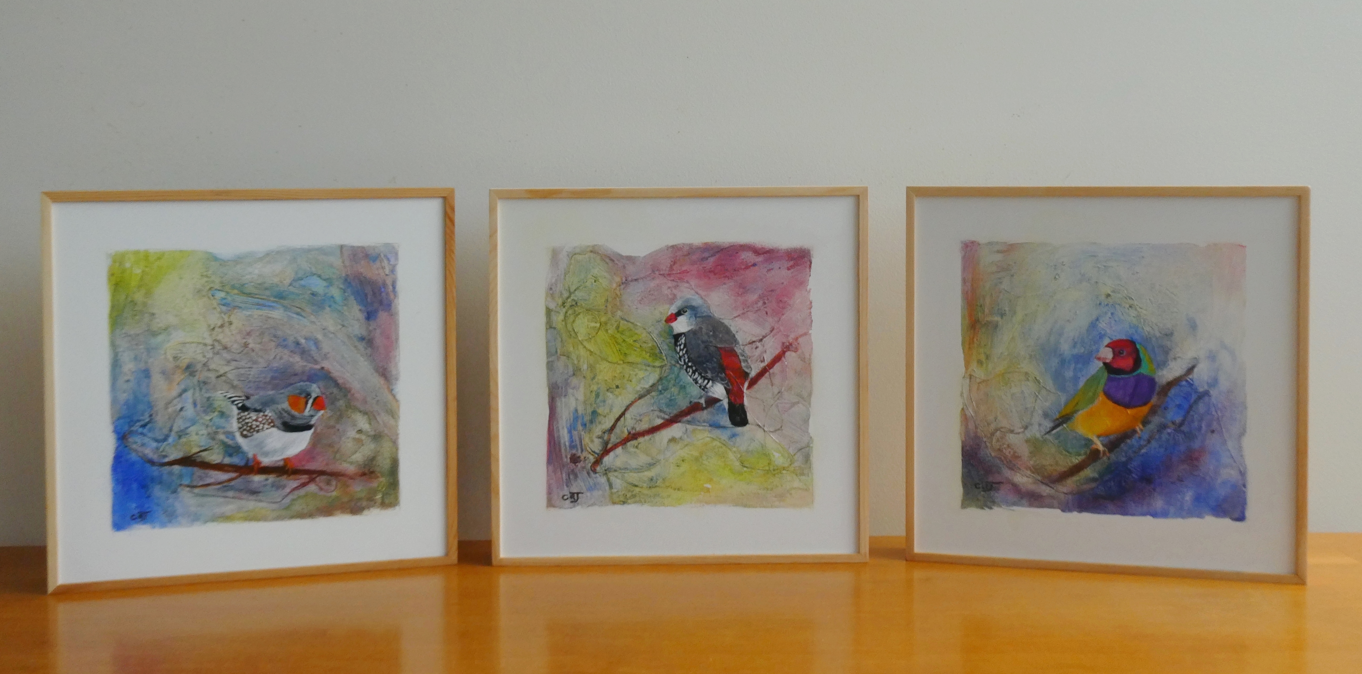 Australian Finches Triptych – These three Australian Finch paintings are in acrylic on an abstract background. They are painted on a timber framed board and do not have glass. Each is 30.5cm x 30.5cm x 3cm deep. The three different finches are a Zebra Finch, a Diamond Firetail, and a Gouldian Finch. All are tiny birds seen mostly in the wild although the Gouldian Finch is very difficult to find. I have enjoyed seeing all these lovely little birds and they would be a great reminder of the wonderful diversity of birds we have to enjoy here in Australia. They can be hung together on a wall or placed together or separately on a table, console or buffet. They are finished with Gloss Varnish and they are ready to hang or stand.