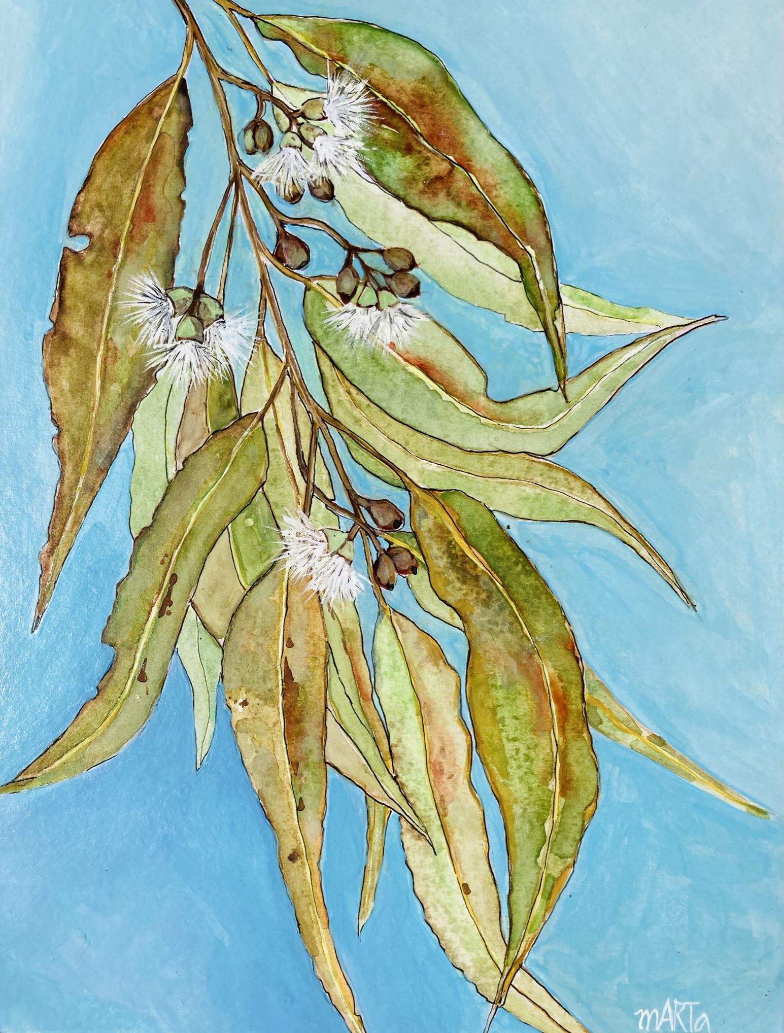 This original painting of ‘Australian Gum’ is in watercolour on 300gsm watercolour paper. It has been protected with two layers of gloss varnish to bring out the bright colours. The dimensions of the painting is 28cm x 35cm and it is framed with a 32.5cm x 40.5cm x 2cm recycled black/white frame without a mat or glass allowing you to hang it immediatly.
