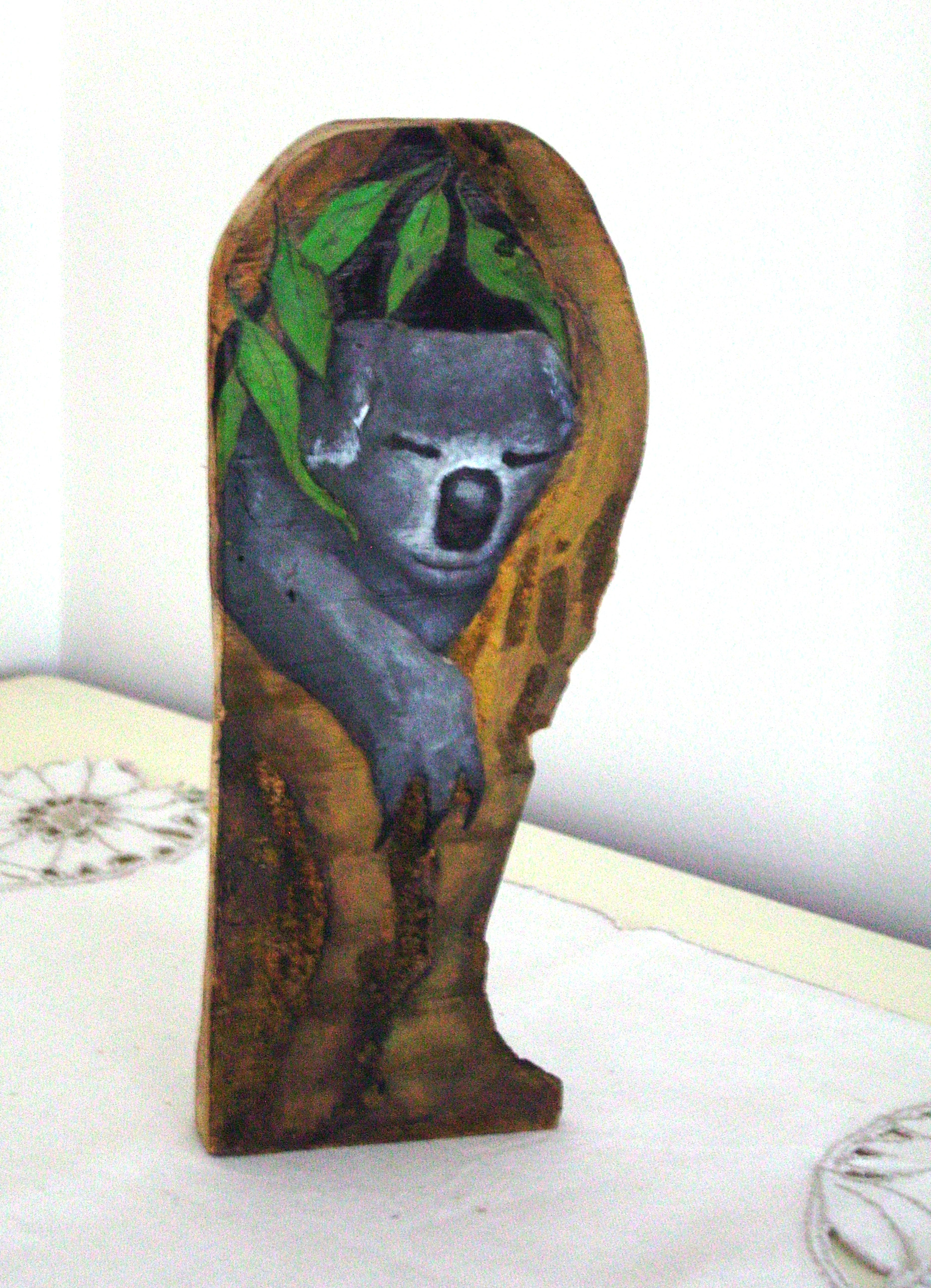 Sleepy Koala is one of four pieces painted on camphor laurel reclaimed timber.