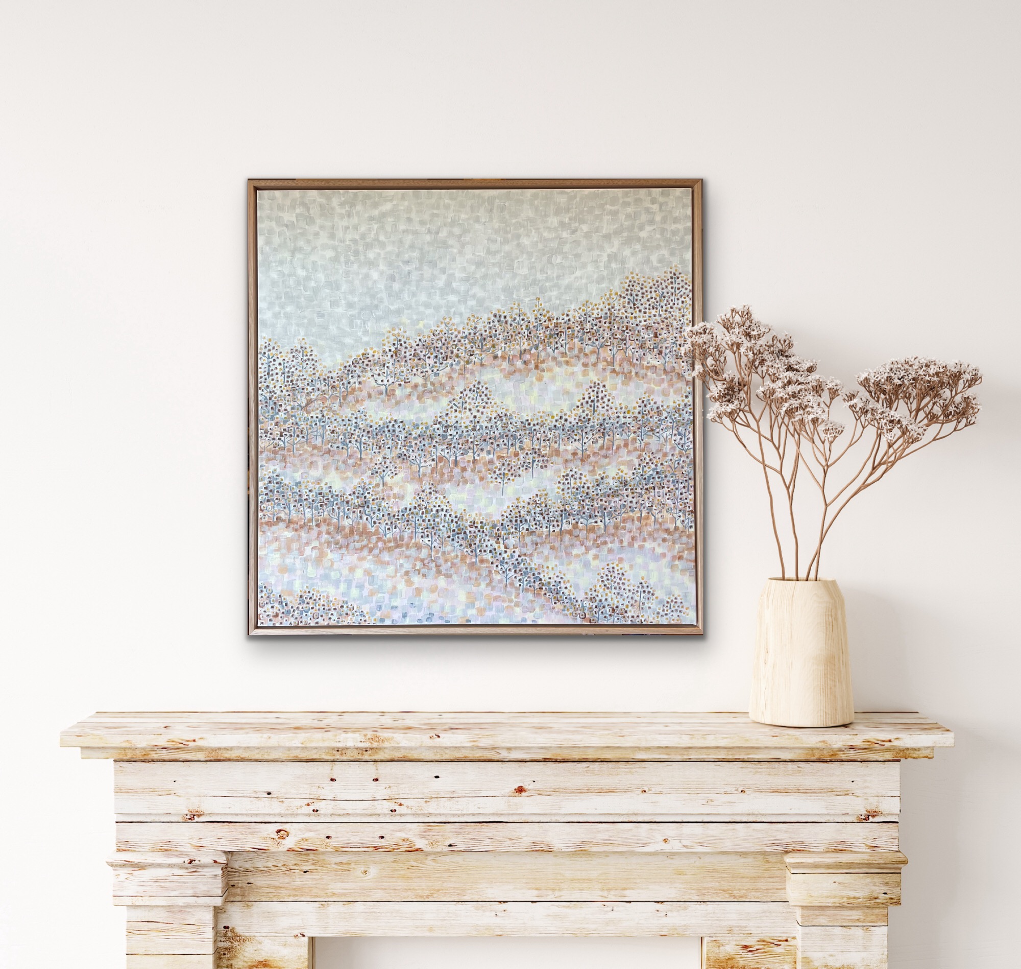 Layers of coloured squares painted onto the canvas. Lots of squares applied, one on top of the other. Beautiful neutral colours, the colours of the Australian landscape during a long hot summer. Trees lining the hills, looking from a distance. Smaller squares outline in white acrylic. A bit of abstract impressionism. Waiting for each colour to dry before the next one added. Takes time but I always love the result. Lots of individual squares. Love the look.