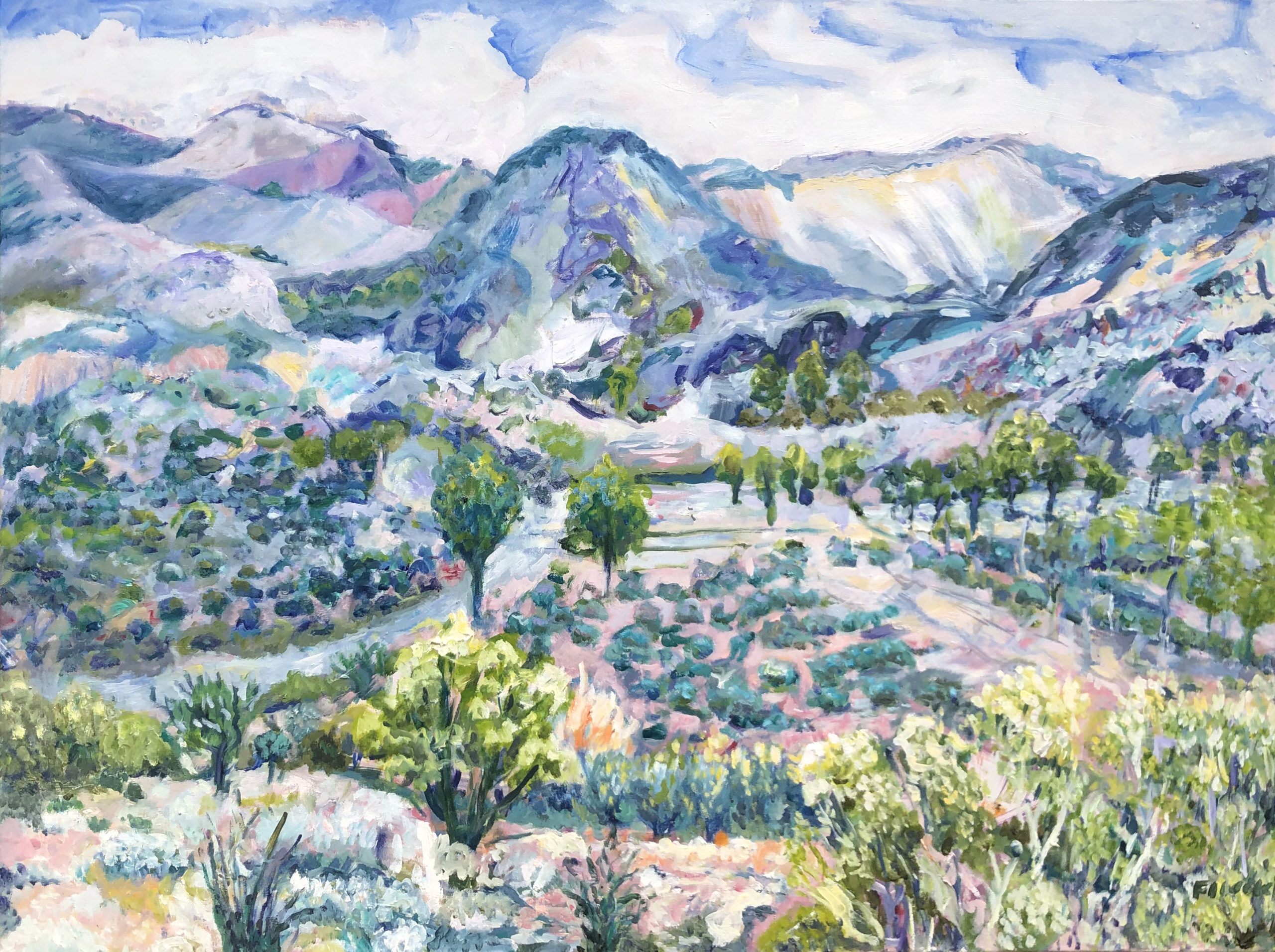 An impressionist oil landscape painting of South Australia’s Flinders Ranges. It features pastel colours of mauve, blue and green with highlights of yellow, pink and white.