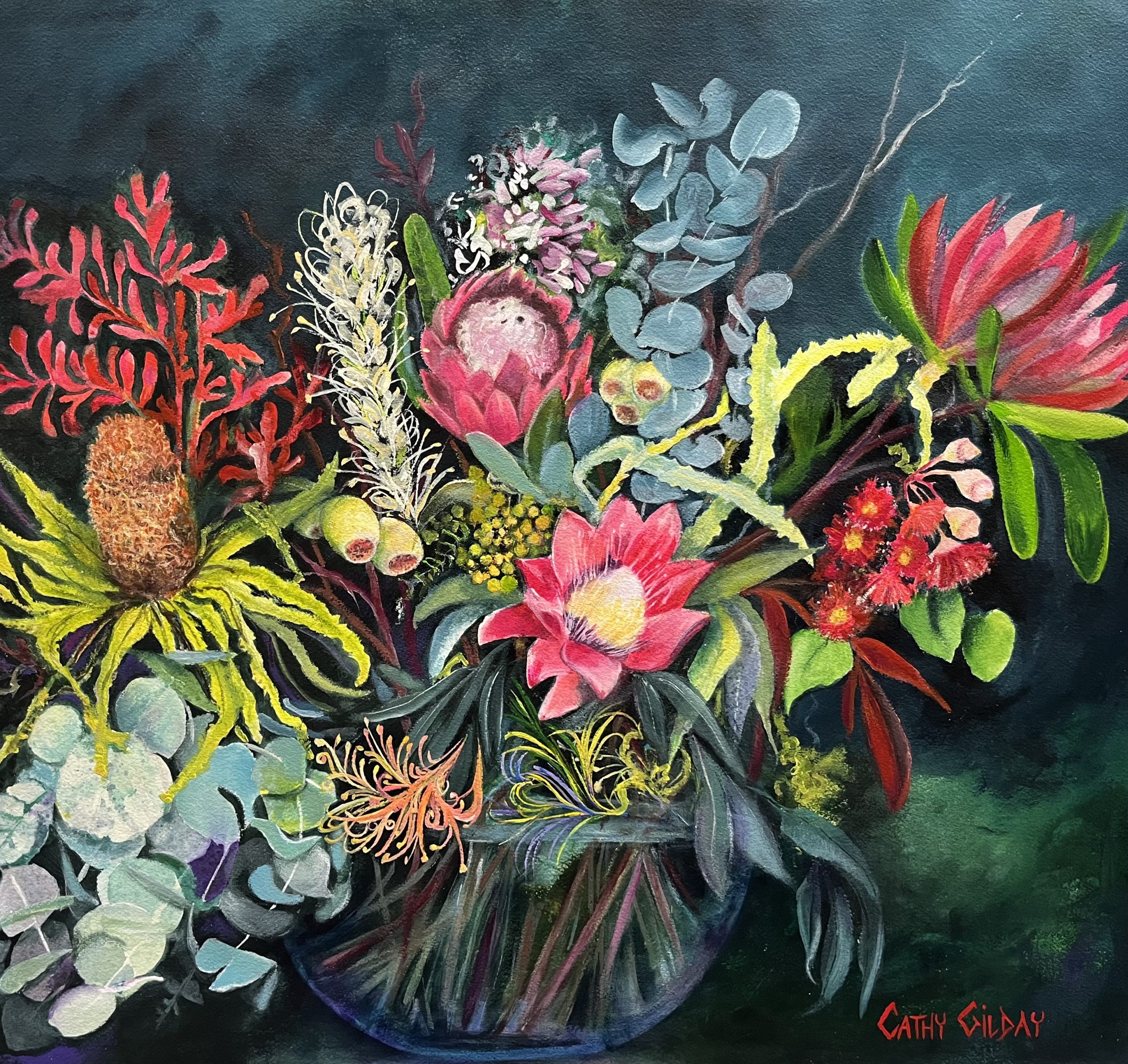 This bold and colourful still-life was inspired by the beauty of Australian native flora. I including an assortment of flowers and foliage, such as protea, banksia, wattle, gum blossoms and kangaroo paw in the composition. Requires framing..