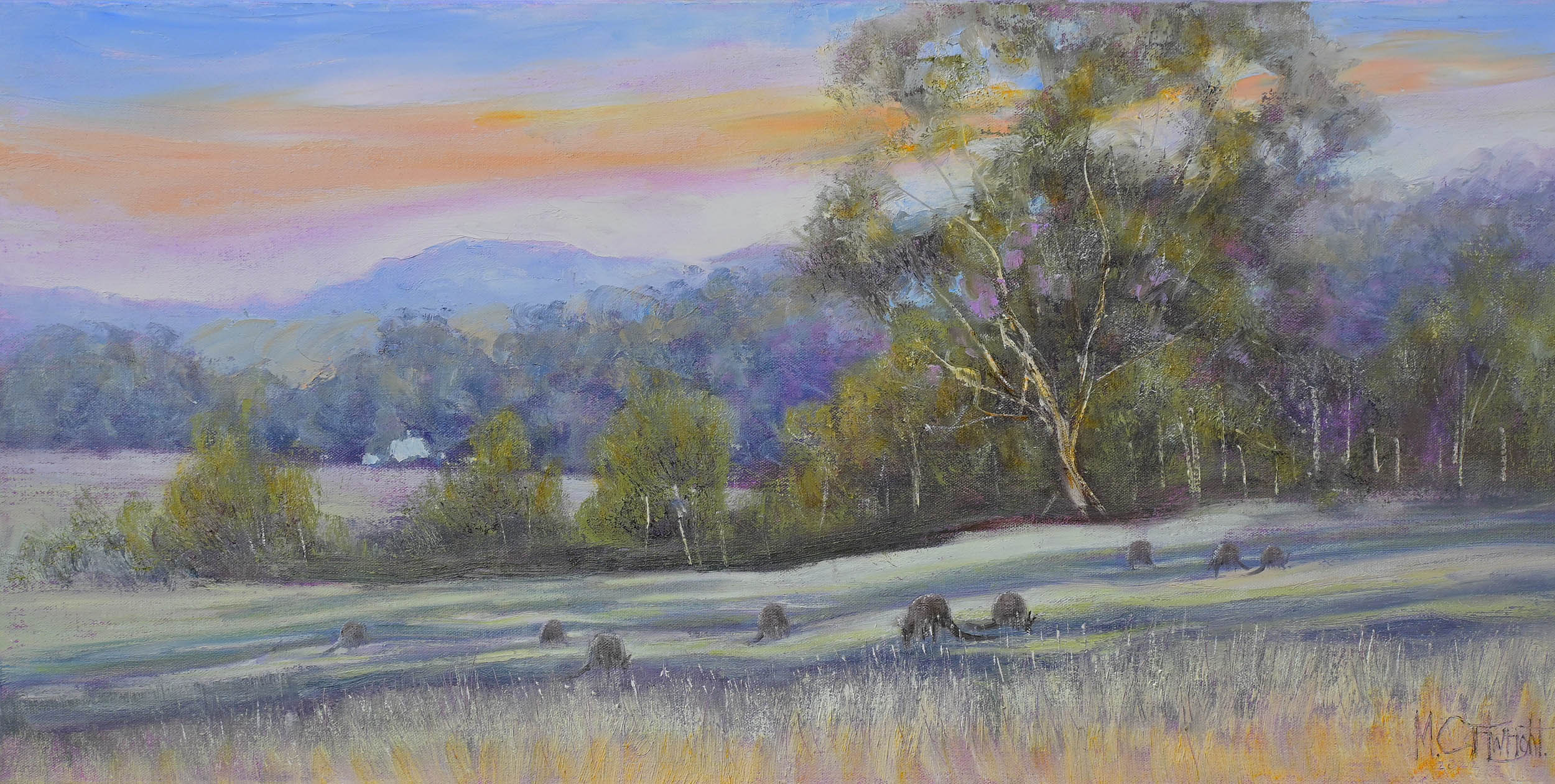 A textured landscape of the beautiful countryside of south Western Australia. I was inspired by everything Australian. The gum trees, kangaroos and the tiny farmhouse in the distance. Spontaneously painted using a combination of brush and palette knife.