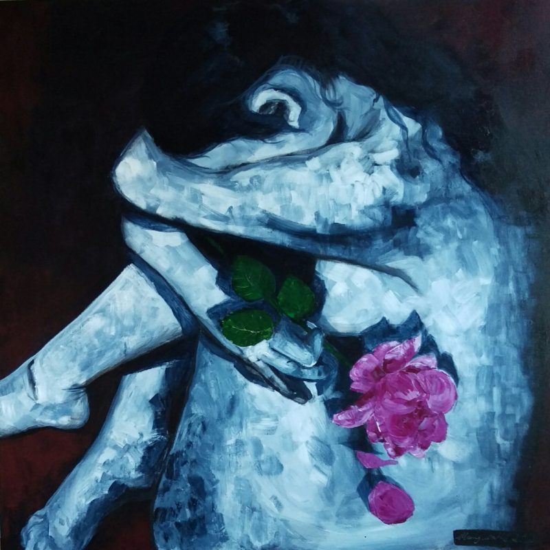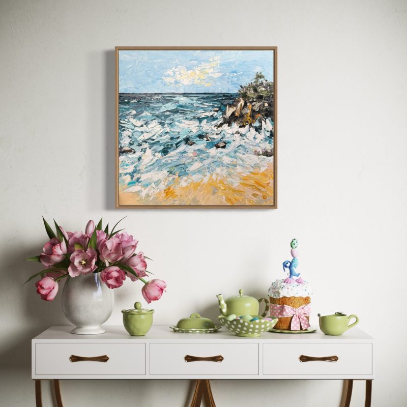 An original oil painting on a cradled wood panel. Sides painted white, wire across the back, ready to hang, unframed, available by requests