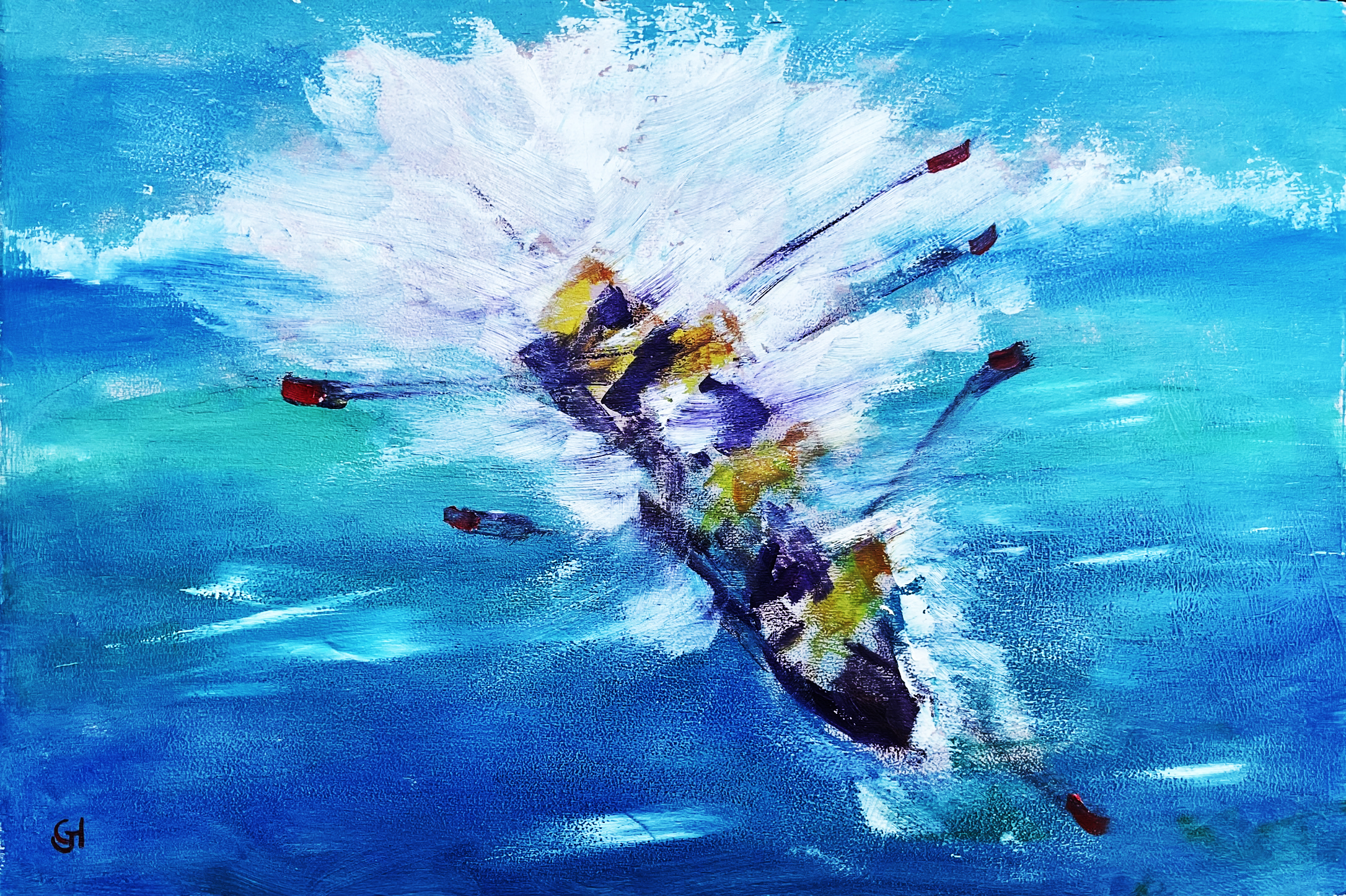 This painting shows one crashing through a breaking wave with the whitewater being thrown high.