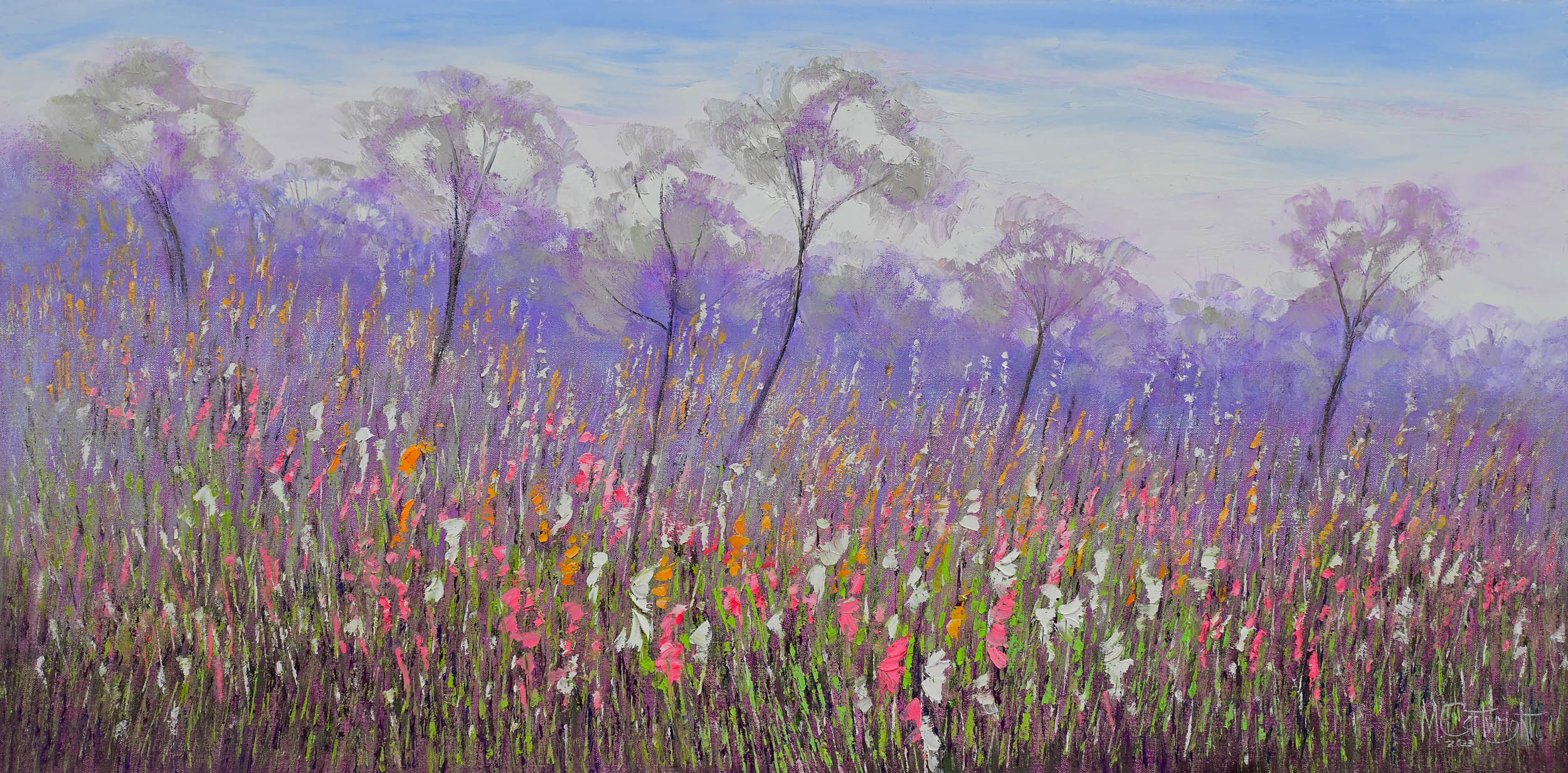 Wildflowers and gum trees grow together in the beautiful countryside of South Western Australia. I was inspired by the colorful wildflowers which receded and merged into the distance. ”Australian Wildflowers 2” is a textured landscape spontaneously painted in alla prima style using a palette knife.