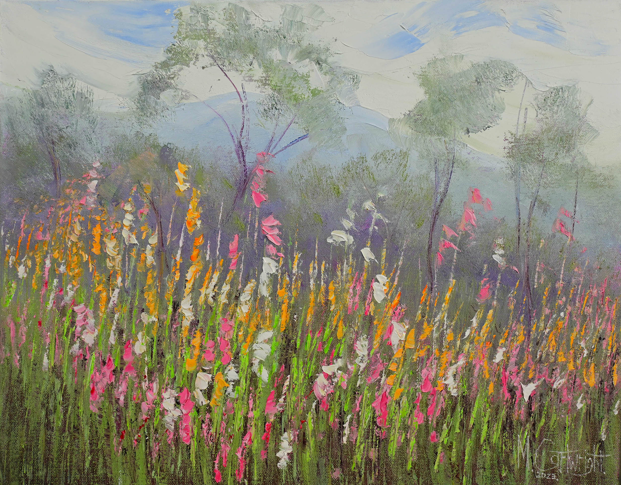A textured landscape of the beautiful wildflowers in Western Australia’s south west region. I was inspired by the decorative patterns of the white, pink and orange wildflowers contrasting against the gum trees behind. Spontaneously painted in alla prima style using a palette knife.