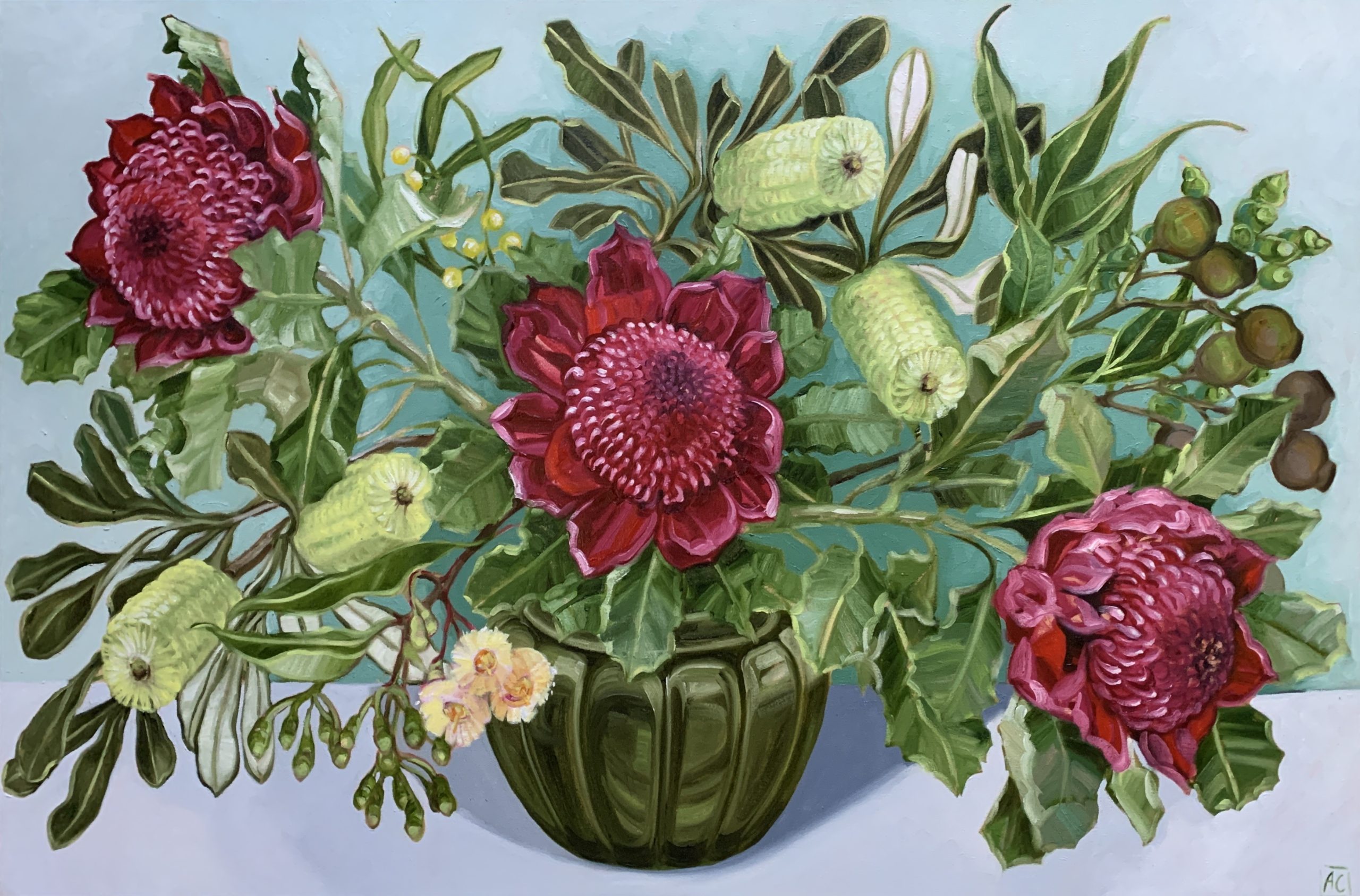 Beautiful large heads of native waratah in a ceramic pot with banksia and gum blossom