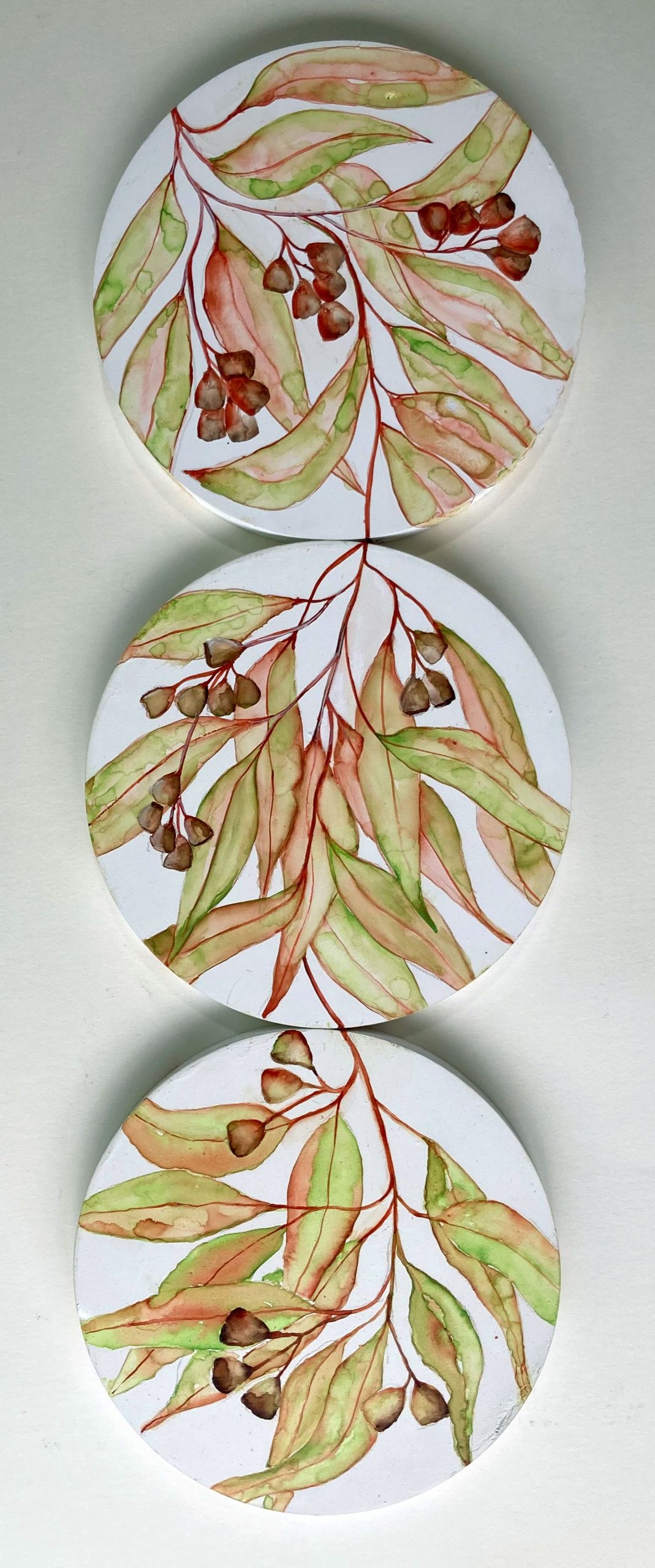 Watercolour triptych of Gumnuts on eucalyptus leaves – Australian flora always inspired my art as it is everywhere around me. I love to paint the drying leaves and gumnuts of the Australian eucalyptus trees with their many different shapes and colours. For this painting I collected a bunch of gum leaves with their gumnuts from my backyard and laid them out on the table.