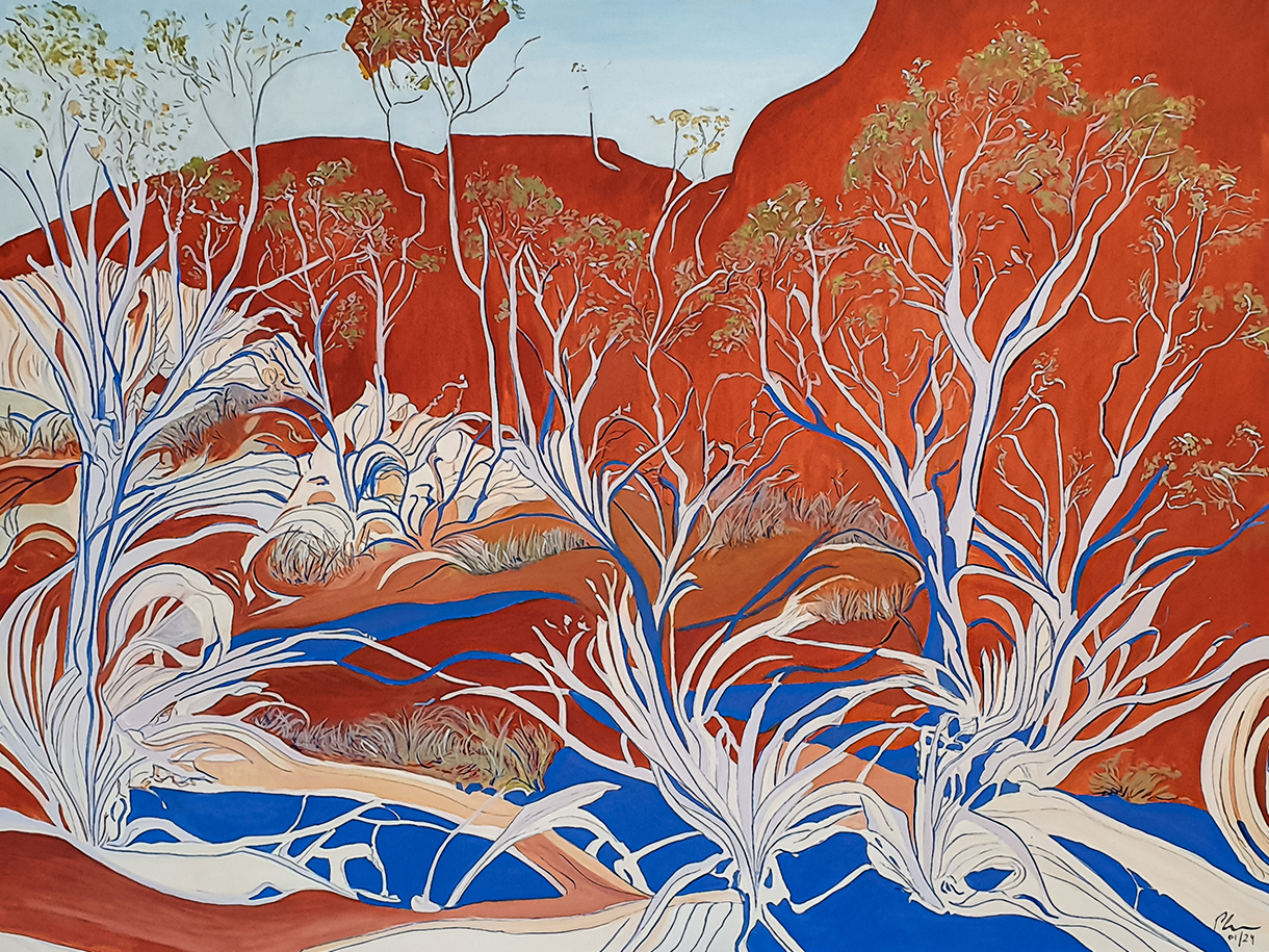 This painting captures the essence of the Australian outback, with its towering red rocks, lush vegetation, and vast expanse of land and sky. It is a beautiful and peaceful landscape that invites the viewer to step into the painting and explore the natural beauty of this unique and beautiful part of the world.