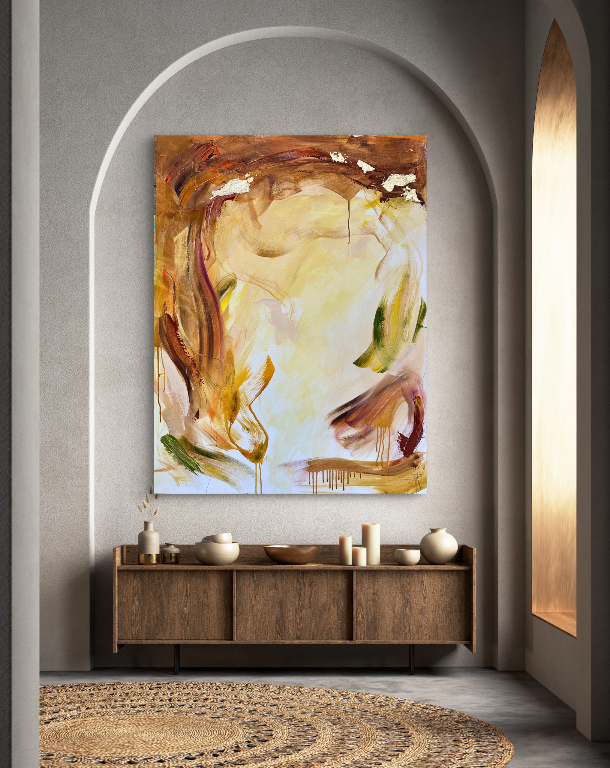 This artwork is a part of my collection ‘The Four Seasons’. As the name suggests, it’s inspired by the hues and the spirit of autumn. Warm earthy tones coupled with gold leaf for a calm and peaceful energy. There are corresponding pieces of Summer, Winter and Spring in the same size, pls connect if you are interested in those and they are not uploaded.