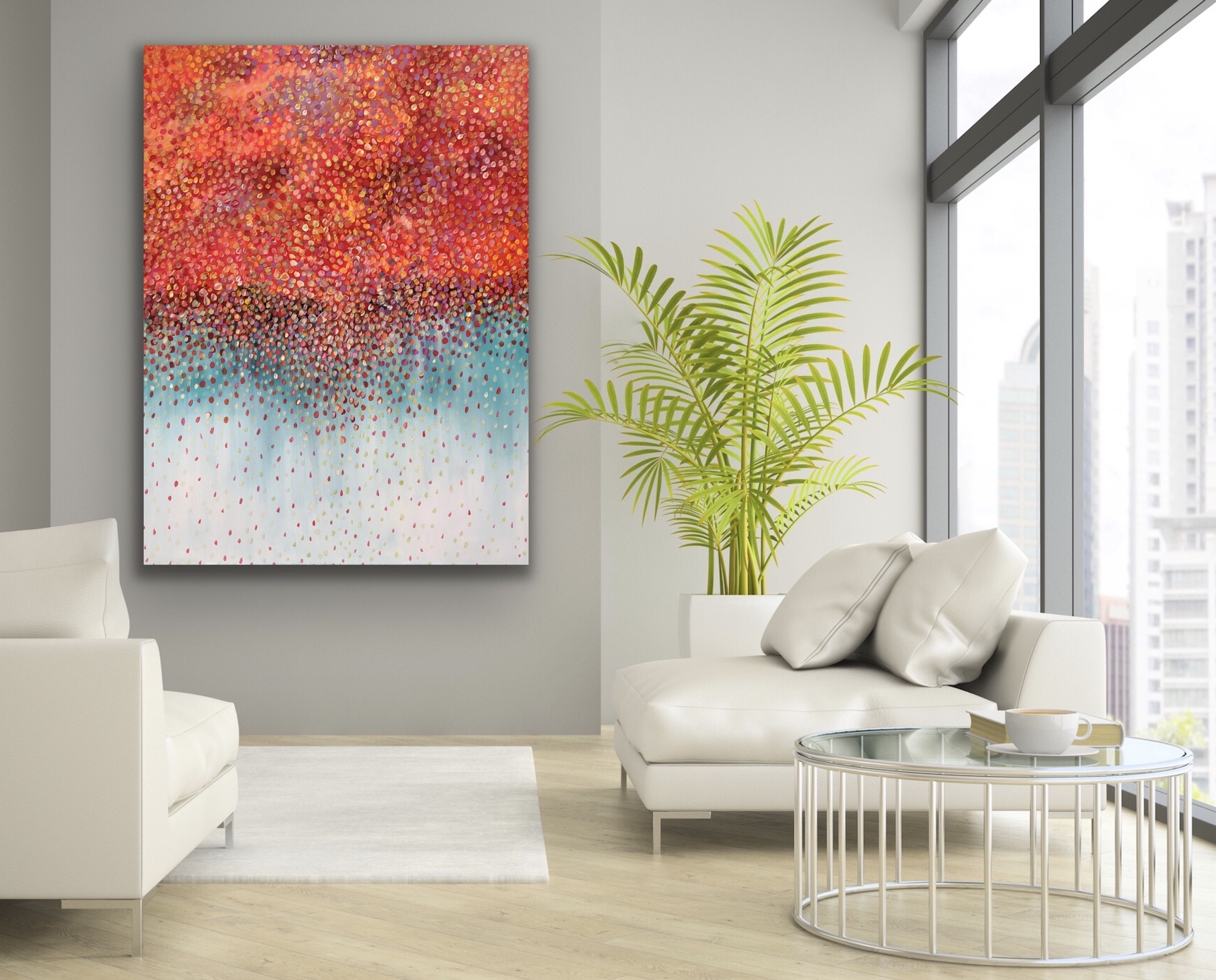 Autumn Bliss a veil of autumn petals covering the sky and weeping onto the landscape. Beautiful reds, orange, yellows, purple coloured petals dancing in the sky . Warm colour petals in the sky swept by the winds creating fireworks in the sky. Capturing the beautiful colours of the petals against the cool blue skies creating so much depth to the painting . This painting is painted with acrylic paints. The painting is signed and dated 2020 at the back and comes with a certificate of Authenticity.