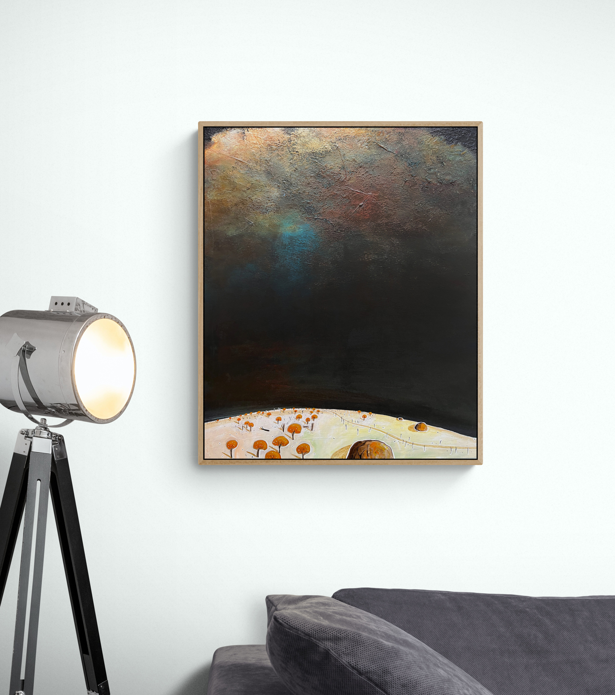 Autumn Falls by Tania Chanter is inspired by the atmospheric Australian sky and the changes of light and mood throughout the day. Tania’s hope is that this painting brings a sense of calm to the room where it lives, and that is makes the people who enter the room feel as though a part of nature is right there with them.
