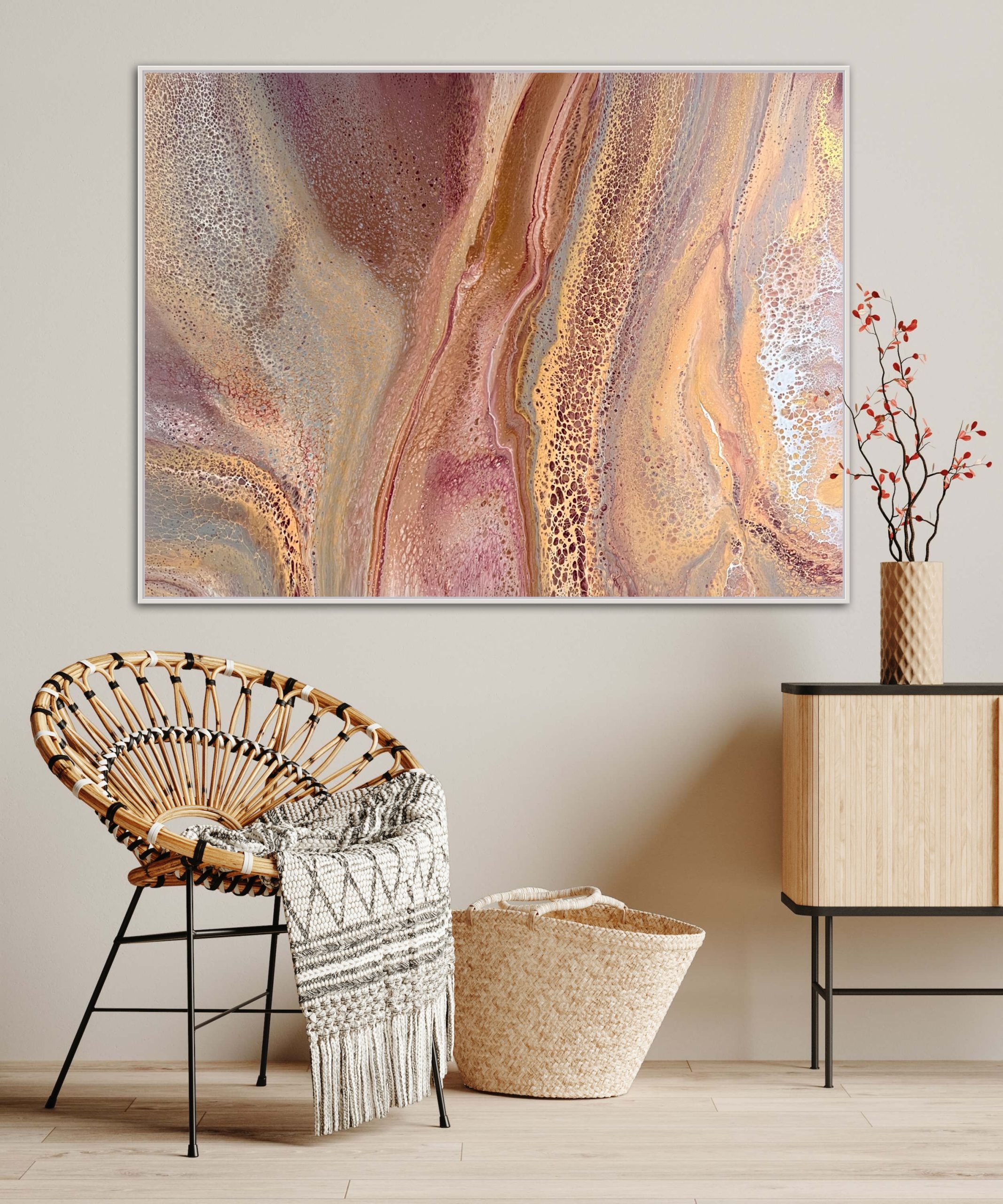Autumn Grace was created using various techniques combined to allow increased flow, interaction and separation of colours to create interesting patterns where pops of colour can be seen emerging from underneath. This added dimension adds lace and cells to the artwork creating an interesting and one of a kind painting that can never be replicated. A gorgeous variety acrylic pigments were used including metallic yellow & rose gold, bronze, silver, cream, magenta, maroon, peach, pink, grey, black and white.