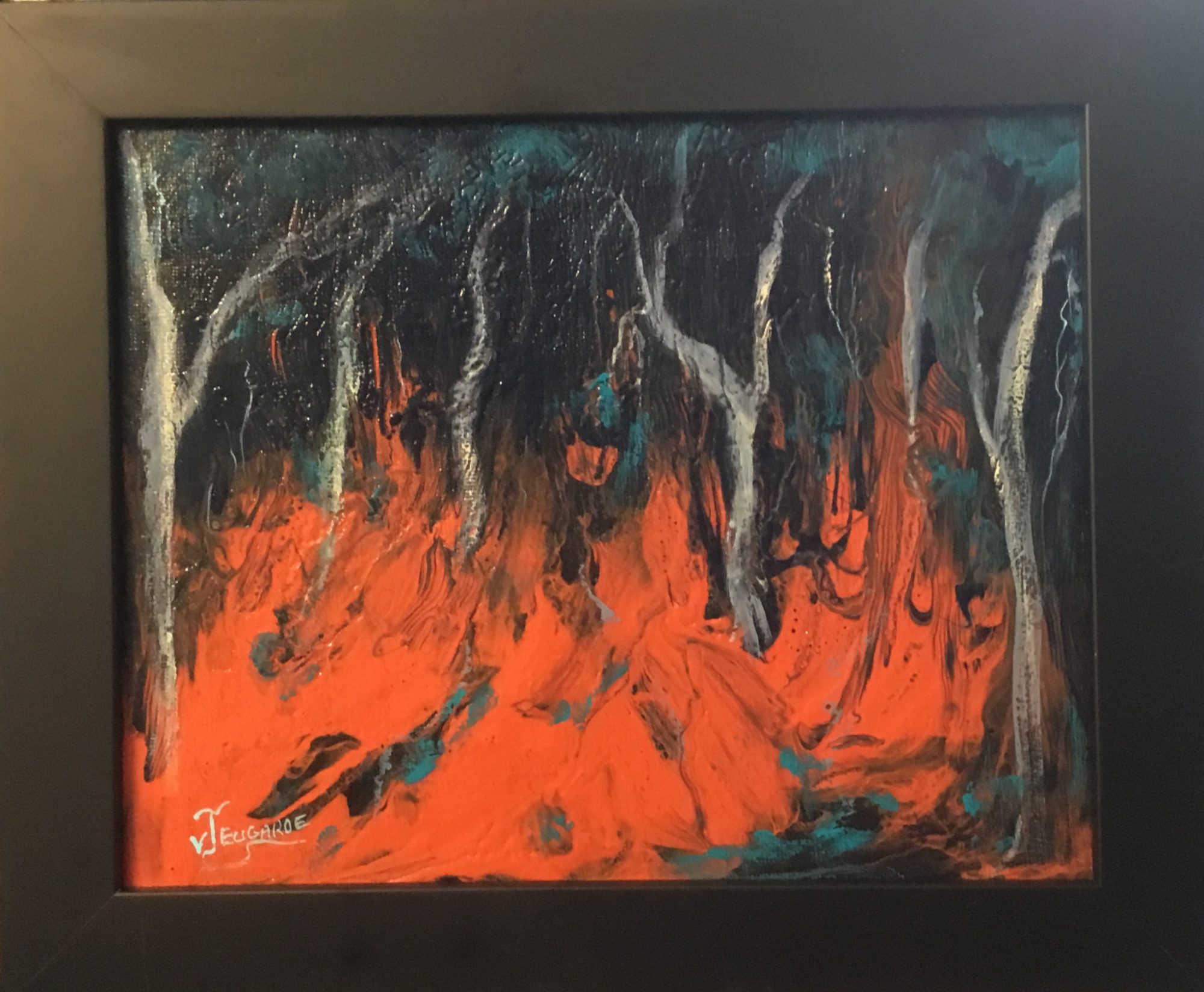 This was first an acrylic pour with no plan in mind except to use colours that represented Autumn and appealed to me, I then added the trees etc and the falling leaves.