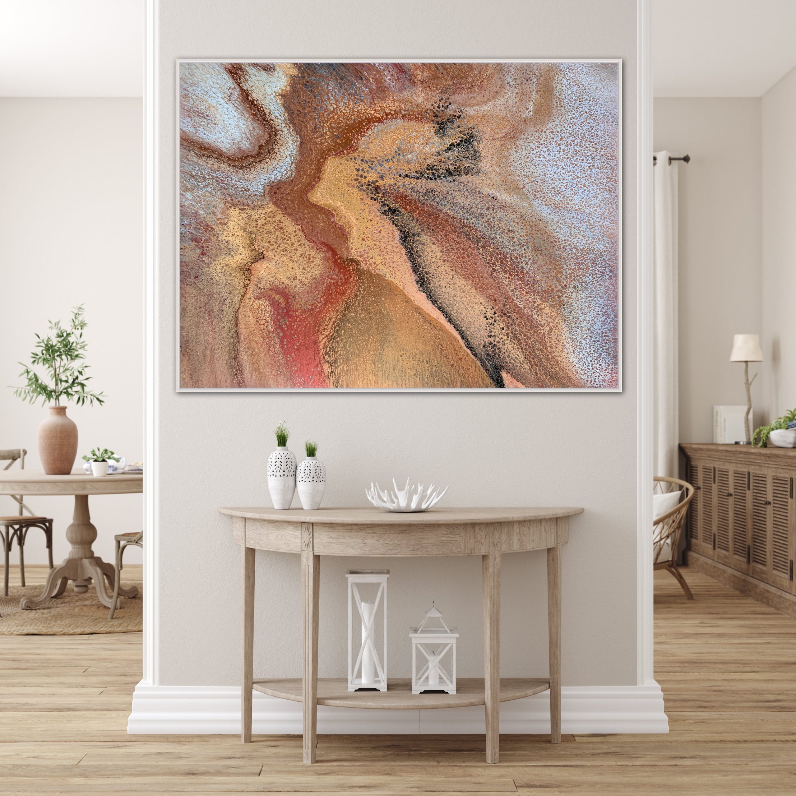 Autumn Light was created using various techniques combined to allow increased flow, interaction and separation of colours to create interesting patterns where pops of colour can be seen emerging from underneath. This added dimension adds lace and cells to the artwork creating an interesting and one of a kind painting that can never be replicated. A gorgeous variety acrylic pigments were used including metallic yellow & rose gold, bronze, silver, cream, touch of copper, grey, black and white.