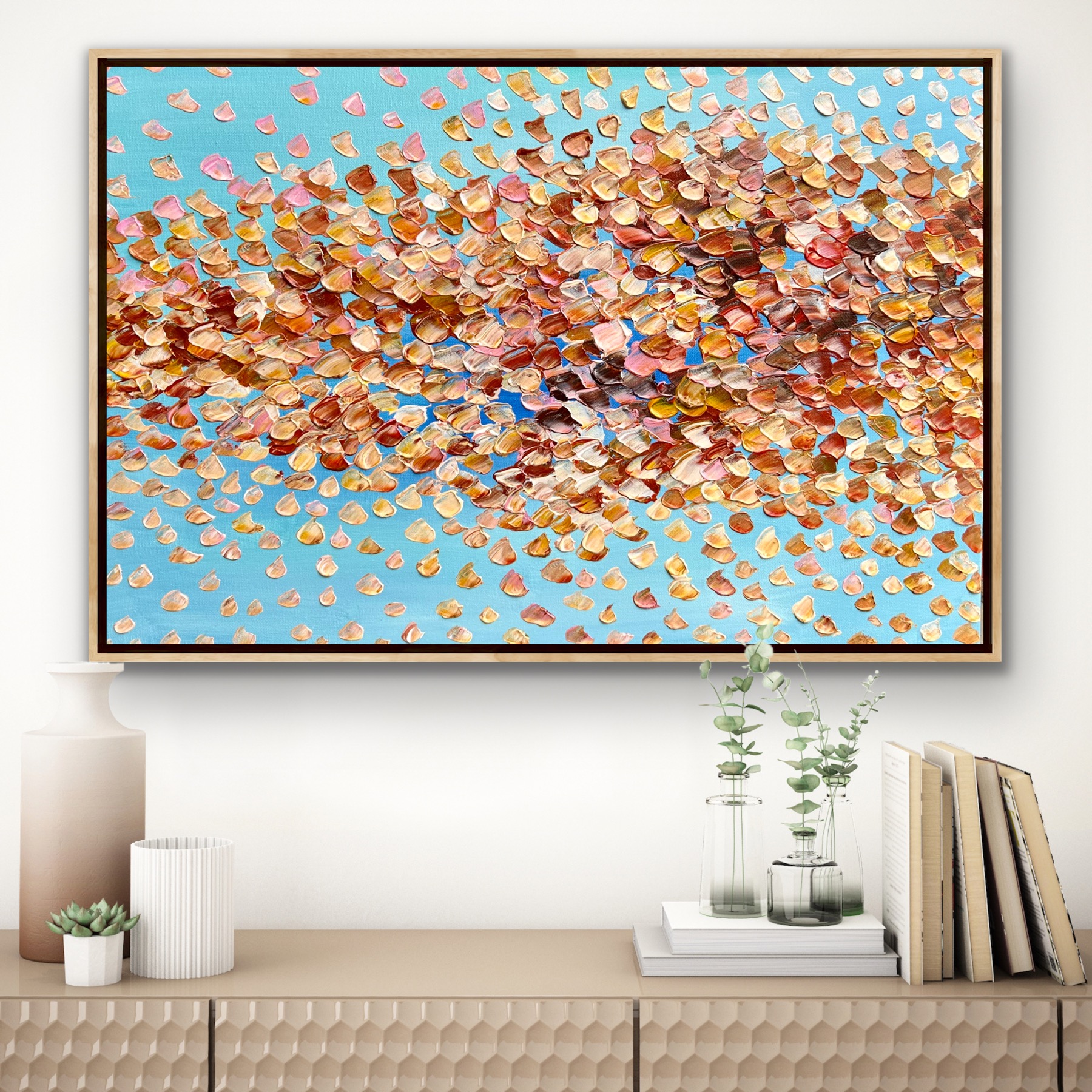 Autumn Rainbow by Melbourne artist Theo Papathomas is a painting of beautiful earthy colours of the petals in the sky falling onto the landscape creating a rainbow of petals. Fireworks of petals in the sky like musical notes dancing to their own song against the beautiful light blue sky. Hope with this work it makes the viewer feel very peaceful and tranquil. I tried to create so much depth in the painting and filling the Sky with petals like shooting stars . The painting is painted with a pallet knife in thick acrylic paint with so much texture that creates a three dimensional feeling to the painting . The painting does not come with an external frame. The painting is signed and dated 2023 at the back and comes with a certificate of Authenticity.