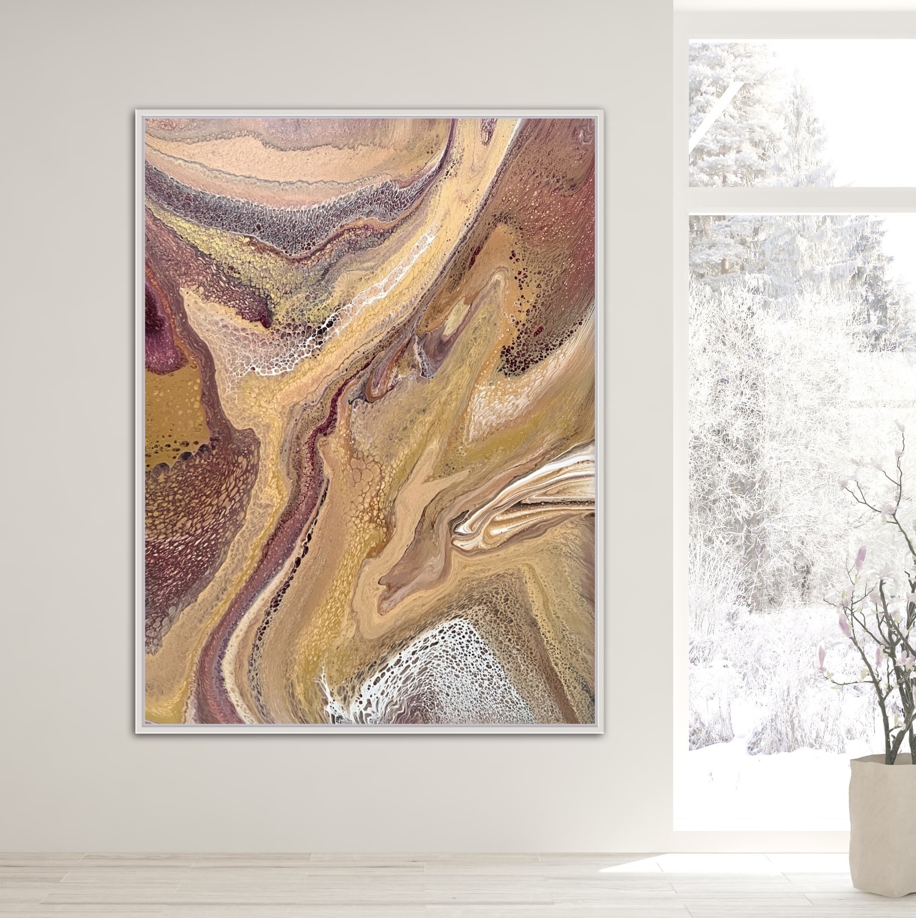 Autumn Reflection was created using various techniques combined to allow increased flow, interaction and separation of colours to create interesting patterns where pops of colour can be seen emerging from underneath. This added dimension adds lace and cells to the artwork creating an interesting and one of a kind painting that can never be replicated. A gorgeous variety acrylic pigments were used including metallic yellow & rose gold, bronze, silver, cream, magenta, maroon, peach, pink, grey, black and white.