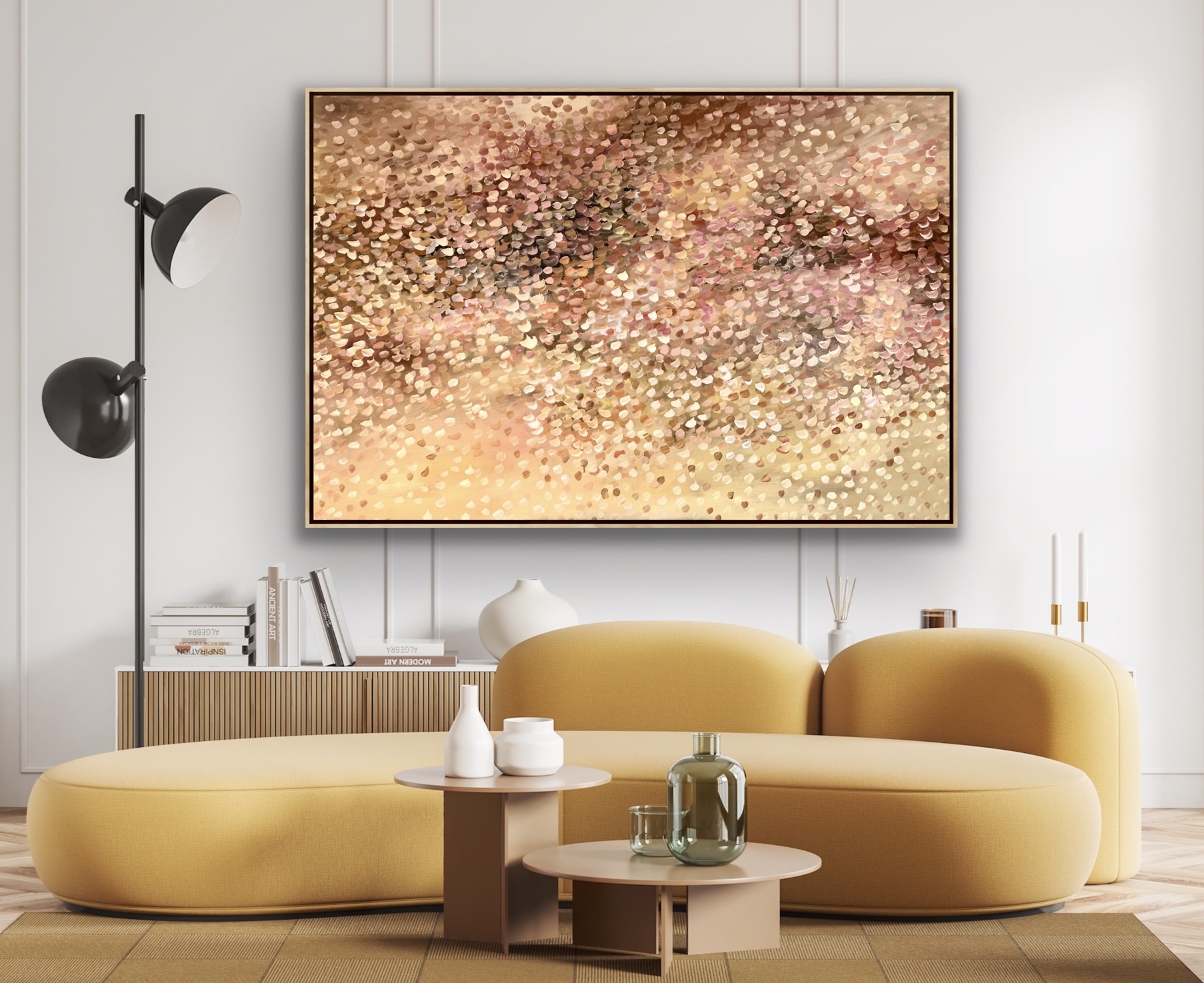 Autumn Rhythms by Theo Papathomas  is a painting with warm colours of petals flying in the wind creating this beautiful bouquet of petals over the landscape with lots of layers of paint. Petals weeping over the landscape creating this veil of petals with so much movement and rhythms. Petals dancing like musical notes over the land creating a carpet of colours painted with lots of layers of oil paint . A very peaceful and tranquil painting with so much depth. The painting does not come with an external frame.The painting is signed and dated at the back and comes with a certificate of Authenticity.