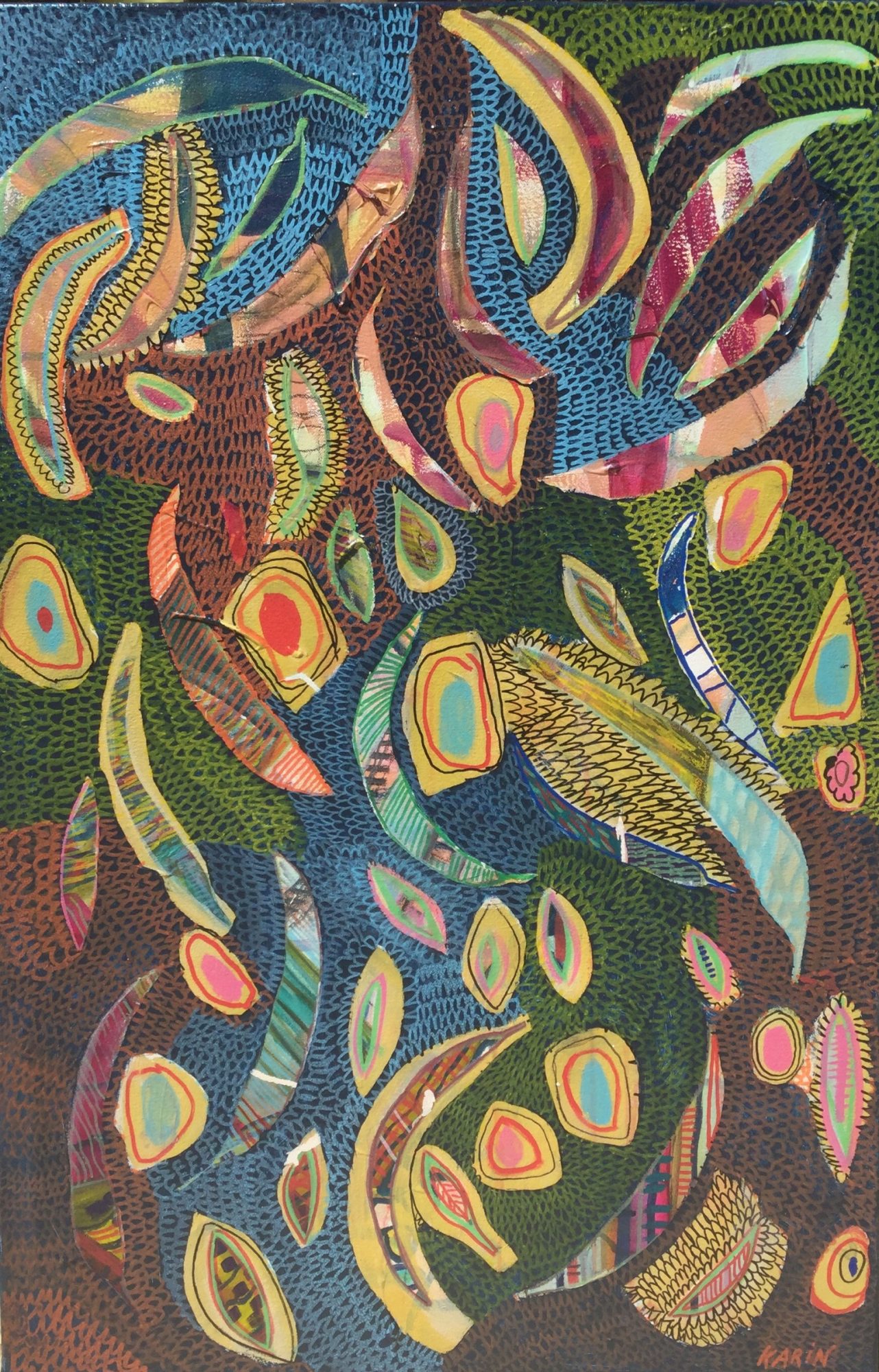 Autumn River is a celebration of Autumn and the falling of leaves. I have a bit of an obsession with leaves, the shapes, the colours and their floating movement and especially when they settle on water just sepended in time! This art work does not depict leaves and river as such, my aim was to create movement, colour, and shape in a abstract composition that is expressive and expresses my joy of Autumn as a celebration of the season.The blue patterning in the composition for me represents a river running through the painting rather like an aerial view.