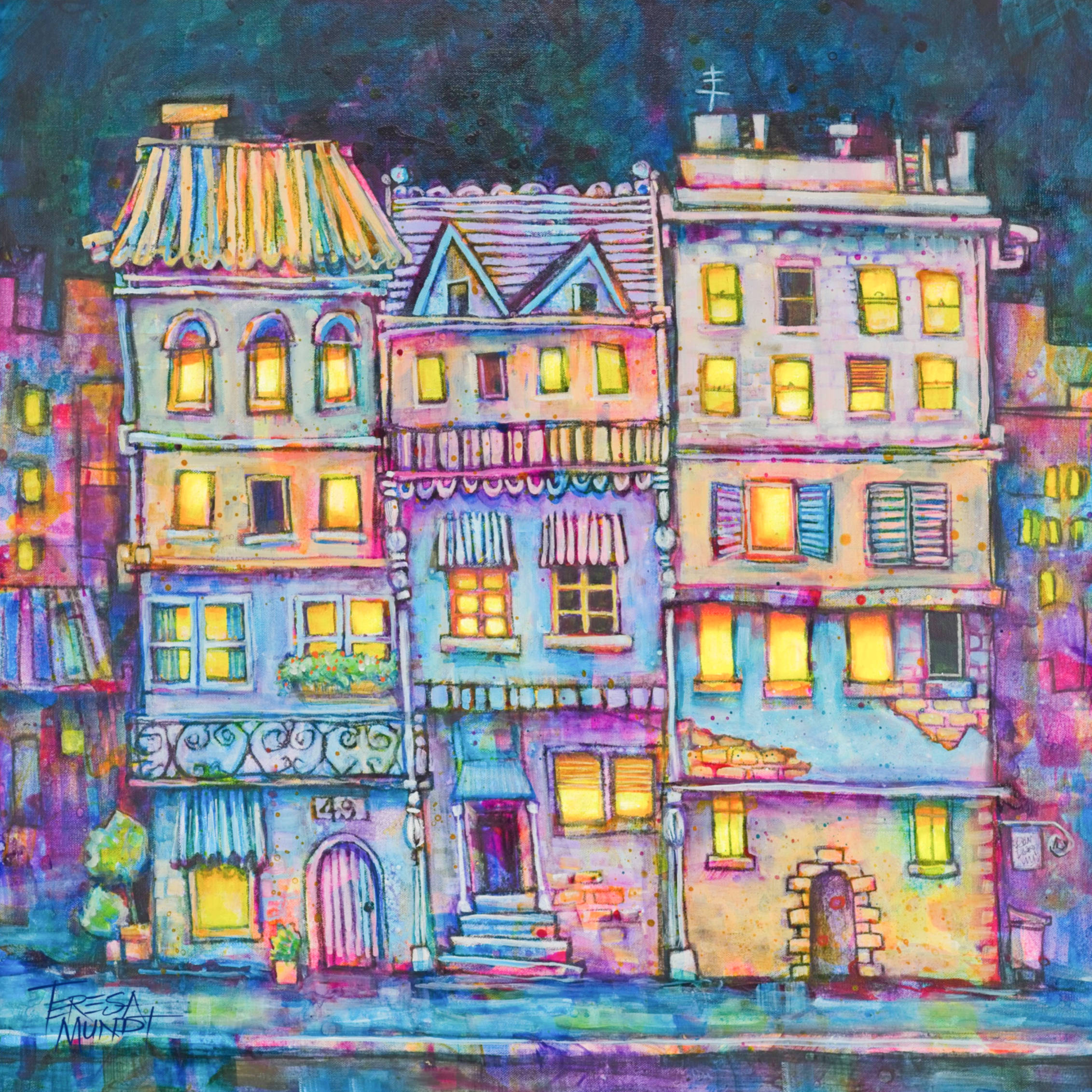 Avenue Arc-en-ciel – Ltd Ed Print by Teresa Mundt. This fine art reproduction is one of a limited edition of 100 prints from the original acrylic artwork “Avenue Arc-en-ciel” (“Rainbow Avenue”) by Teresa Mundt. Each print is numbered and signed on the front by the artist. This print was created using Epson archival inks on 285gsm premium cotton rag, and has a matte finish. “Avenue Arc-en-ciel” is packed in a protective sleeve and comes with a signed Certificate of Authenticity. Printed image size: 40cm x 40cm.